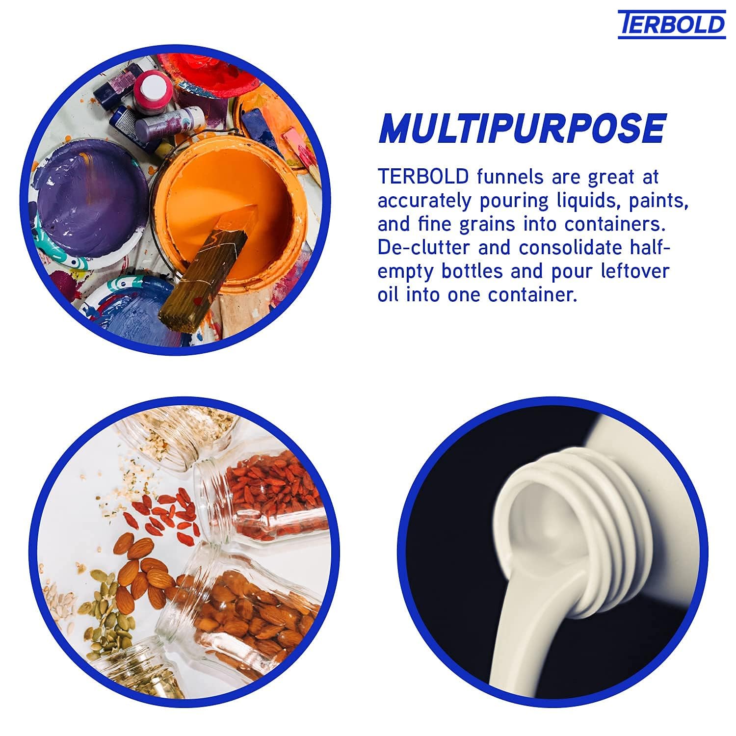 - DURABLE PLASTIC | Plastic funnels won't shatter when dropped and won't crack or craze with hot and cold temperature changes. Narrow ends are slant-cut for cleaner pours