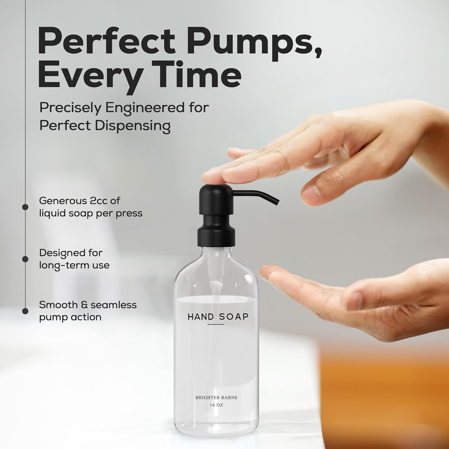 - AMERICAN DESIGN, UNCOMPROMISING QUALITY - Crafted with meticulous attention to detail, our glass soap dispenser set features 2 fortified 16oz glass bottles along with a set of corrosion-proof 304G stainless steel silver pumps. All designed in the USA to provide unbeatable quality and enduring style that you can trust.
