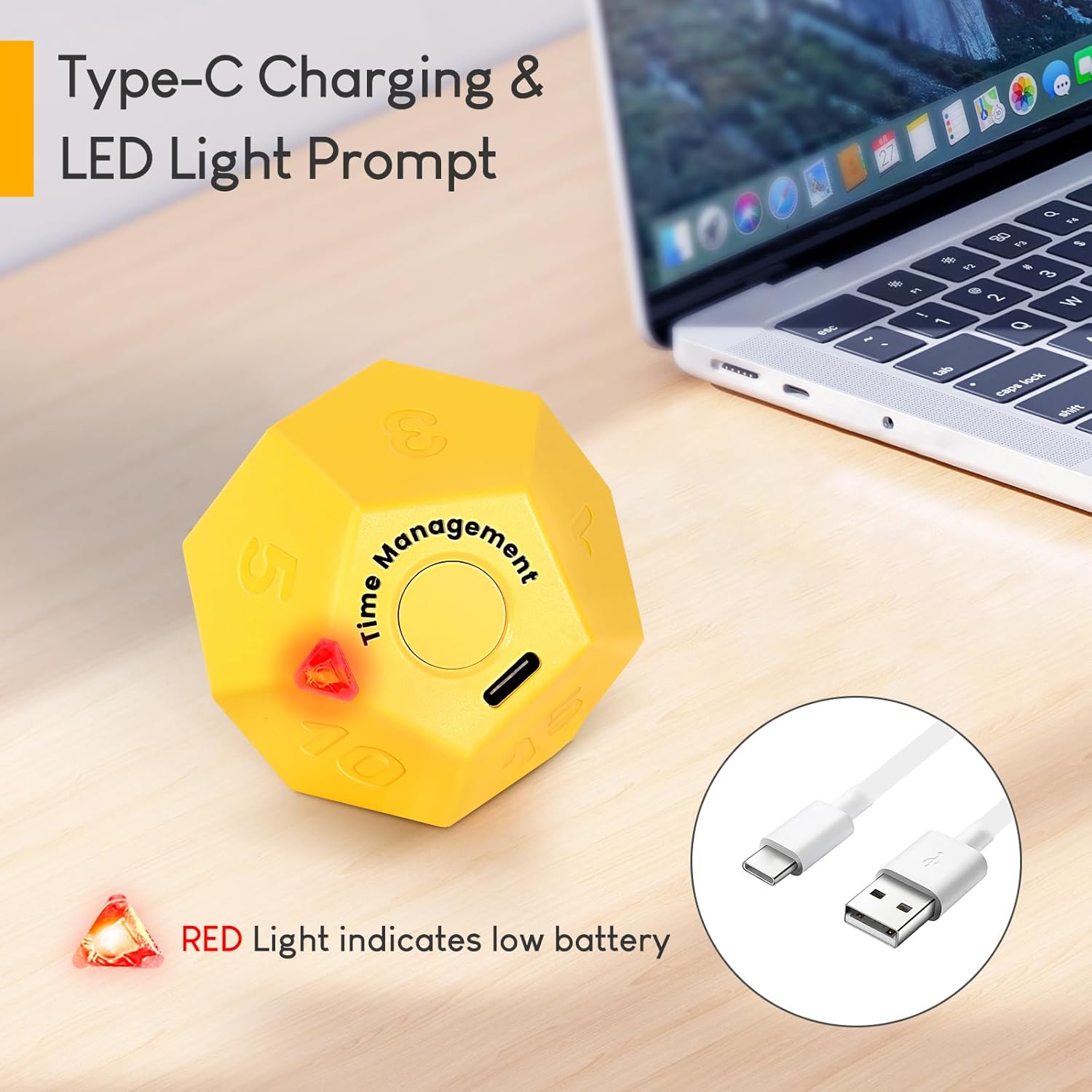 Yellow Pomodoro Timer - 11 Preset Productivity Cube, Ring/Vibrate Mode, Rechargeable, Perfect for Cooking, Learning, Exercise and Beauty