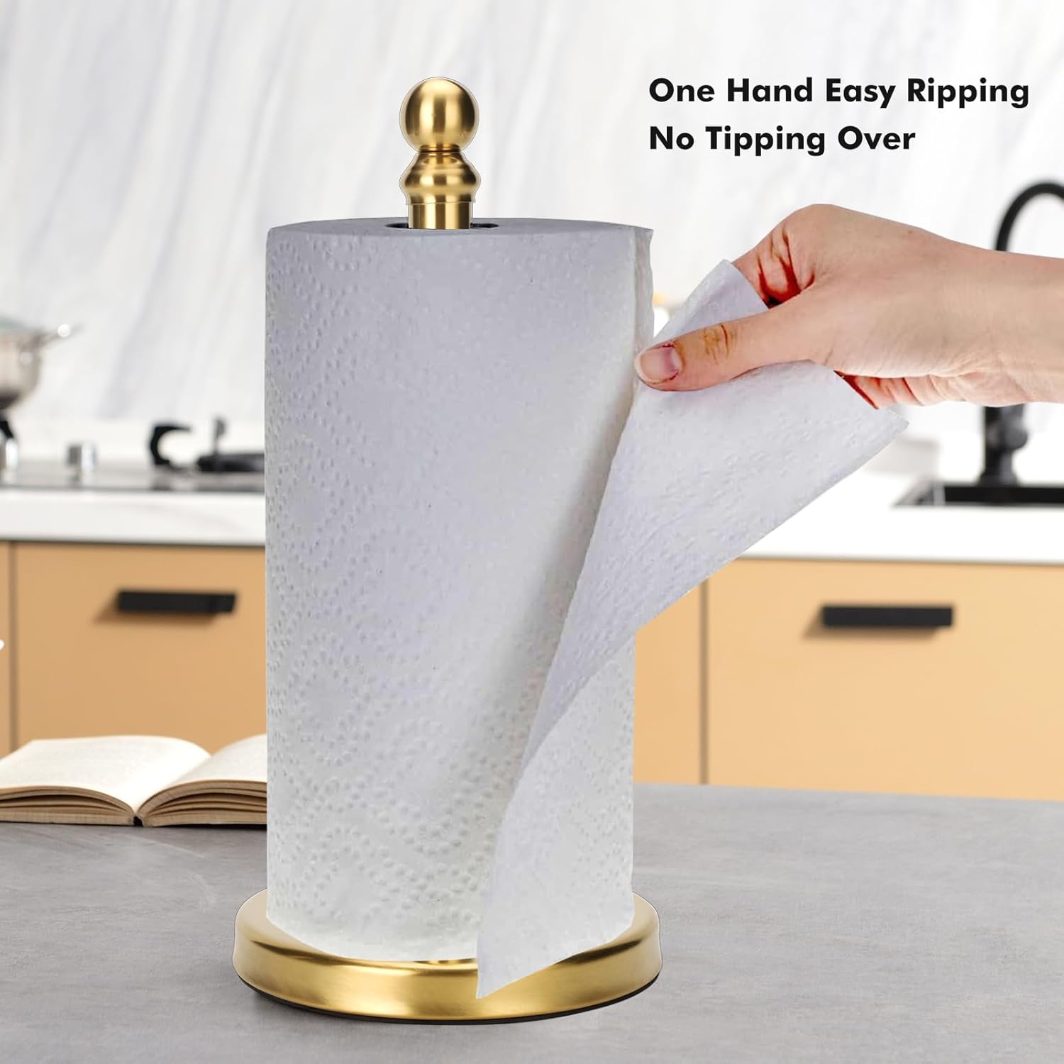 - Sturdy weighted base, no tipping over when ripping paper off with one hand. Constructed with stainless steel, paper towel holder stand is very heavy, and it stays firmly on countertop when ripping paper off one-handed.