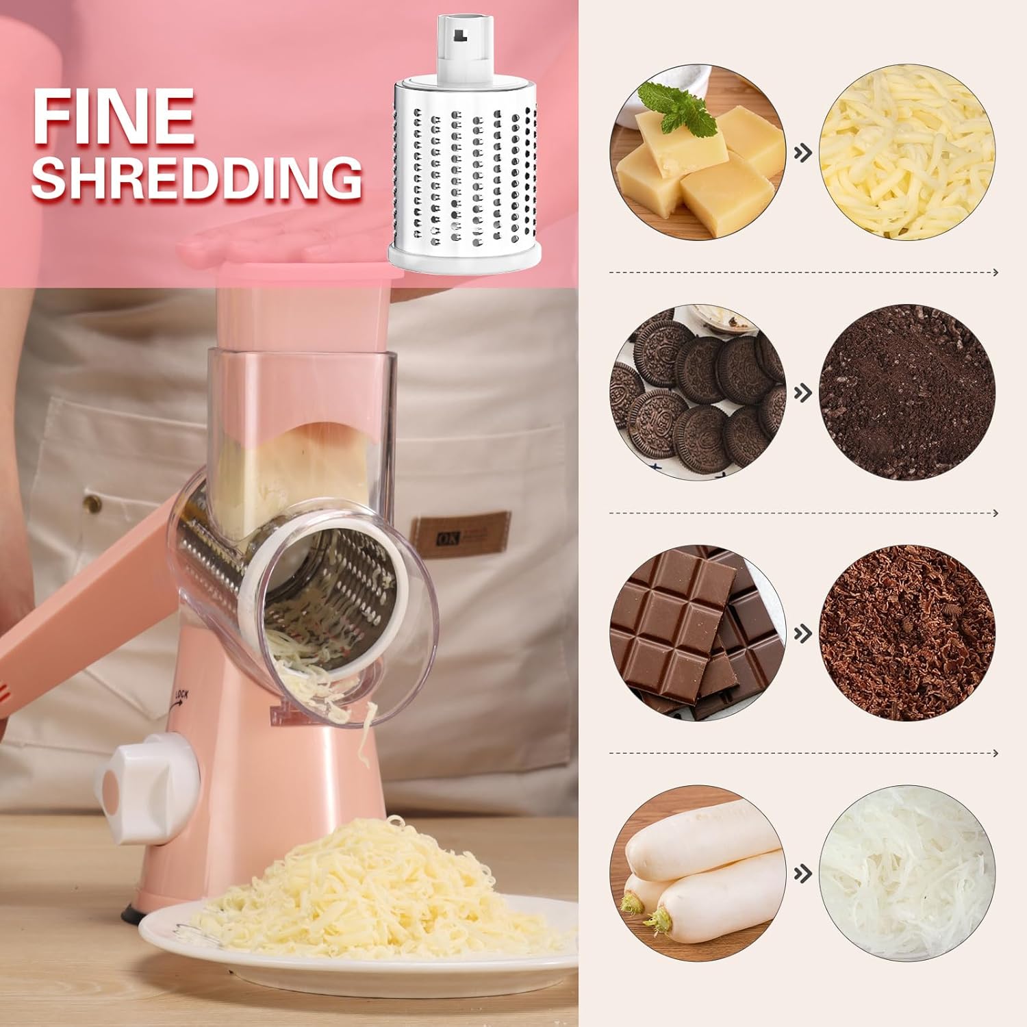Cambom Rotary Cheese Grater Hand Crank Cheese Shredder for Fresh Cheese, Vegetable, Nuts,Non-slip Suction Base, Free Cleaning Brush Three Blades, Pink