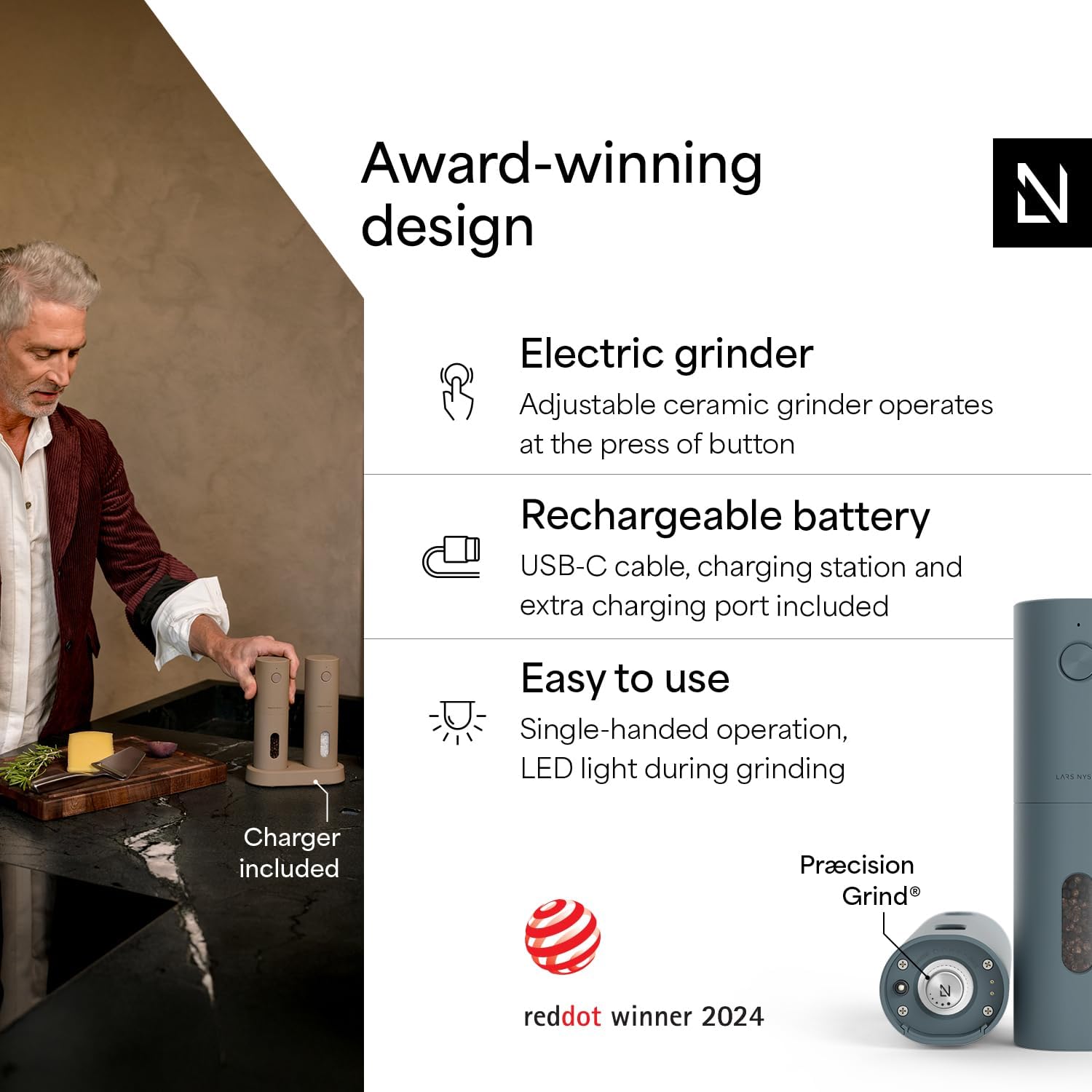 - DESIGN ELECTRIC SPICE MILL SET (2 pieces): The Electric Salt and Pepper Mill Set "Spænding" by LARS NYSØM impresses with functionality and design. Perfect for everything that adds spice to life - such as pepper or salt. chili, or other herbs.