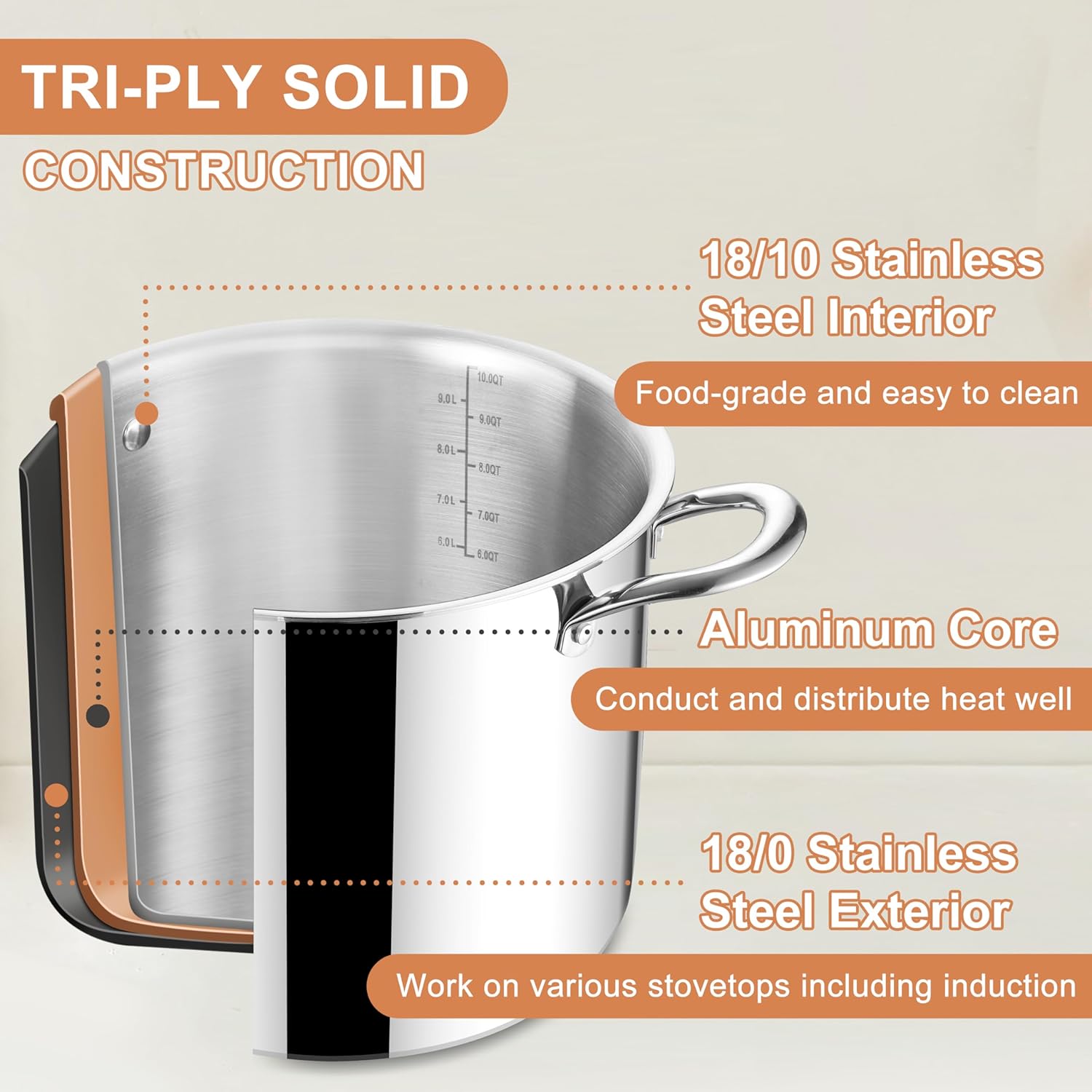 - Healthy material, the stock pot has 18/10 stainless steel interior, aluminum core, 18/0 stainless steel exterior, remarkable resistance to corrosion, durable for long time use, food-grade material without harmful substance, safe for food contact
