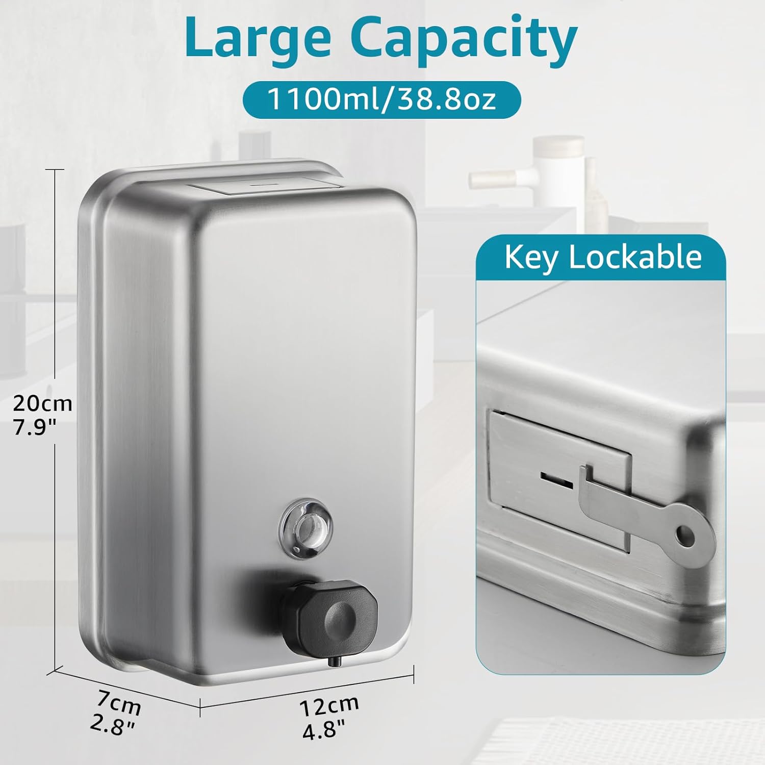 Commercial Wall Mount Soap Dispenser - Stainless Steel Bathroom Hand Soap 38.8oz Liquid - Anti-Leak Pump and Large Capacity Brushed Refillable