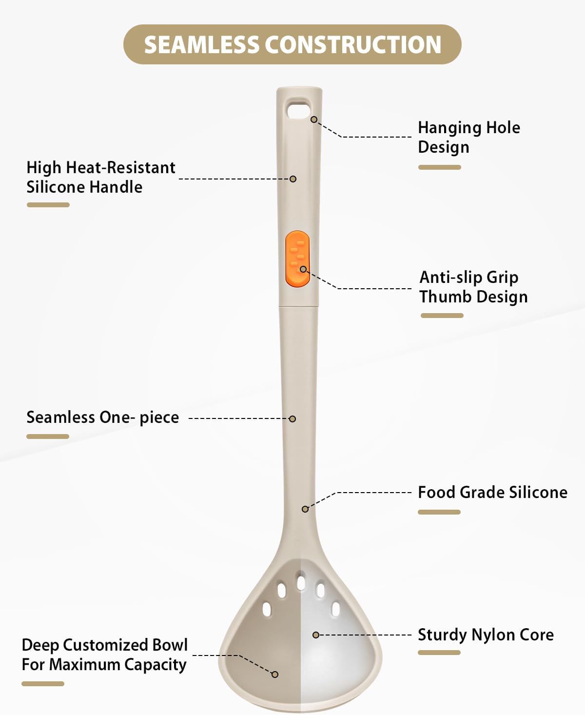 Silicone Pasta Fork and Ladle Spoon Set, Large Non Stick Kitchen Utensils for Cooking,Stirring,One Piece Serving Spaghetti, Soup, Sauce (KHAKI)