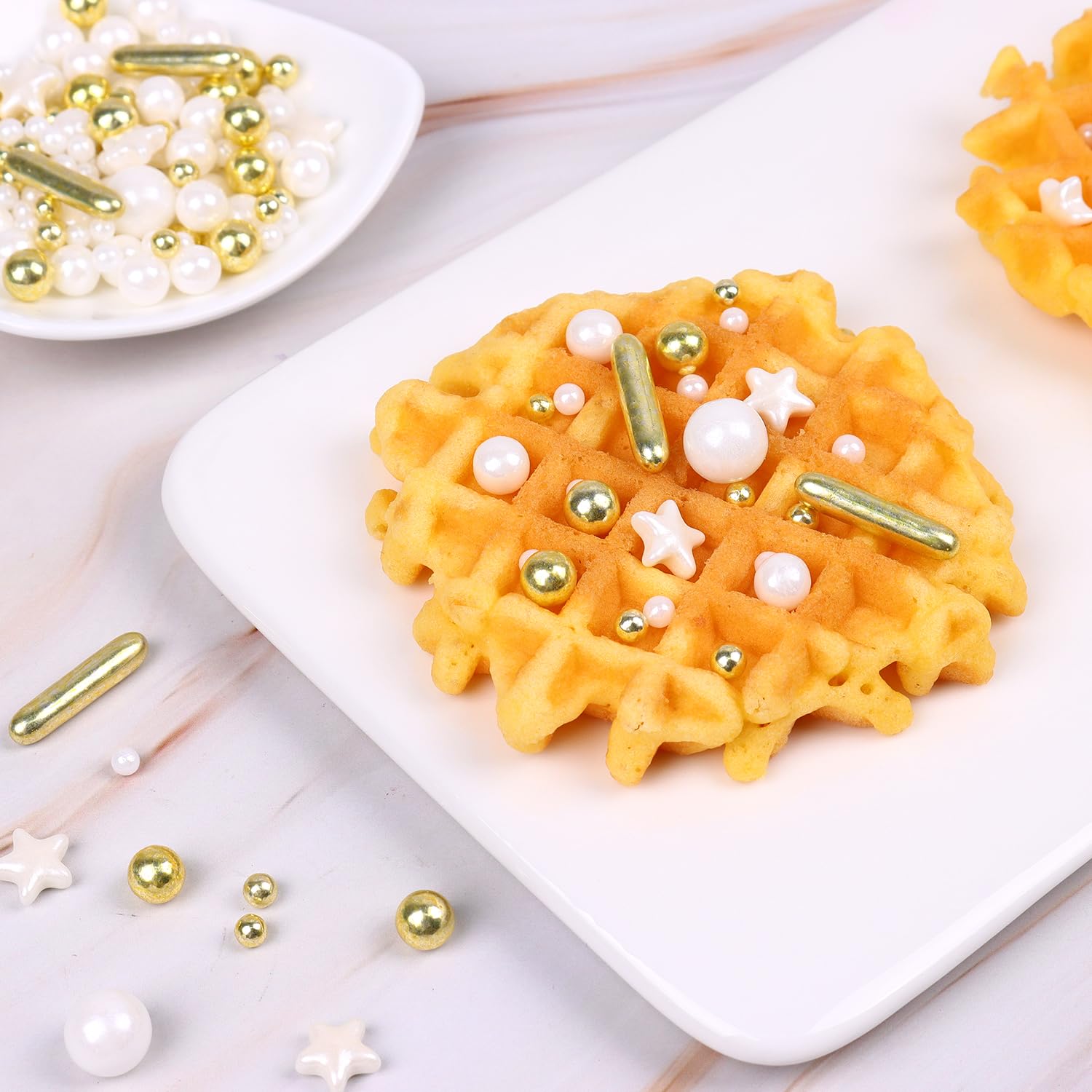 White Deluxe Gold Sprinkles for Cake Decorating 4.23ounce - Sugar Mix Contains Star & Pearl Sprinkles for Cupcake Toppers, Ice Cream, Candy, Cookie Decorations - Holiday Party Supplies