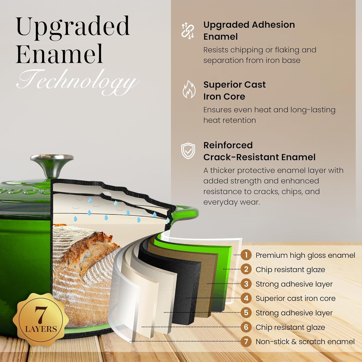 Nuovva Enamelled Cast Iron Dutch Oven Pot with Lid – 6.4 Quart Non Stick Casserole Pot – Heavy Duty & Oven Safe up to 500° F for Bread Baking, Braising, Stews, Roasting – 28cm Green