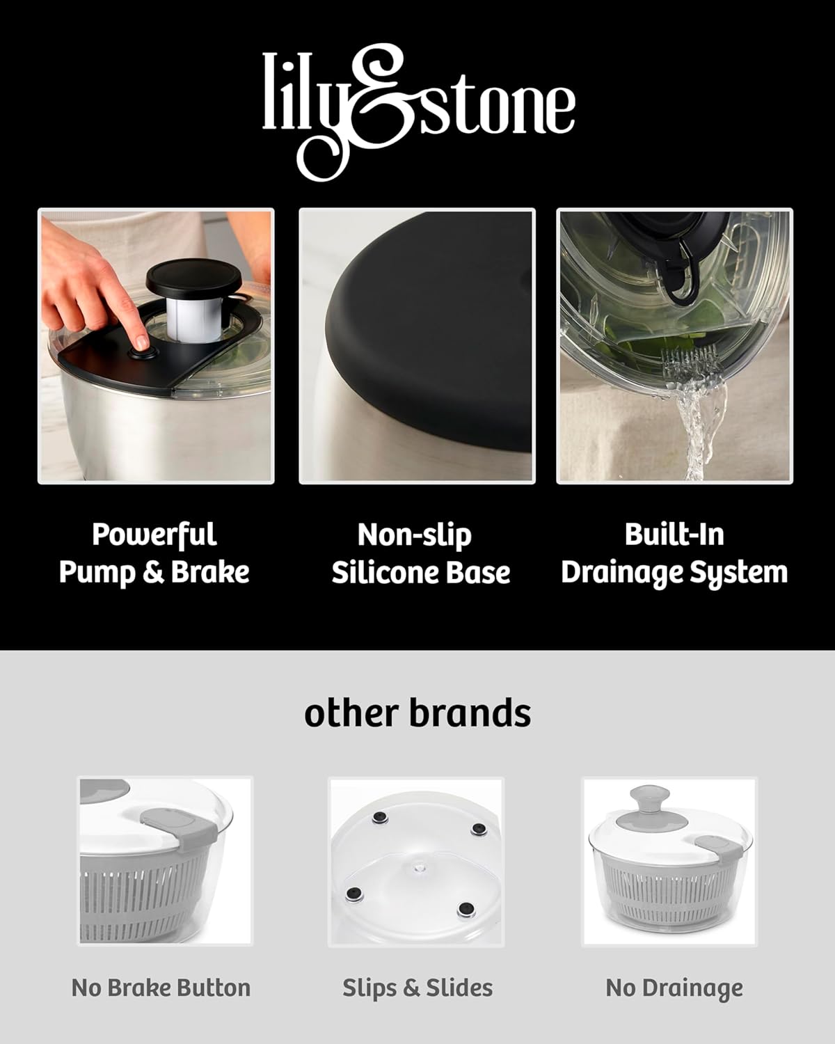 - Smart Design - The non-skid base provides stability and control, so the bowl container remains steady on your counter while using the fruit cleaner lettuce spinner pump; Features a brake button for spin control at your fingertips - simply press to stop