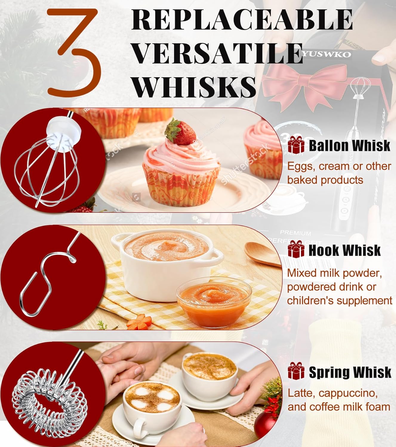 - 🎀【3 Replaceable Stainless Whisks】The frother set includes 3 removable whisk heads. A U-shaped coffee frother is suitable for mixing milk powder and children's complementary food. The mesh type is suitable for coffee foaming. There is also a balloon beater just for baking. Hand frother weighs 0.5 lbs and is easy to carry. The handle of the milk frother is ergonomically designed for easy grip and use, while the bottom is flat for easy standing and storage without a stand.