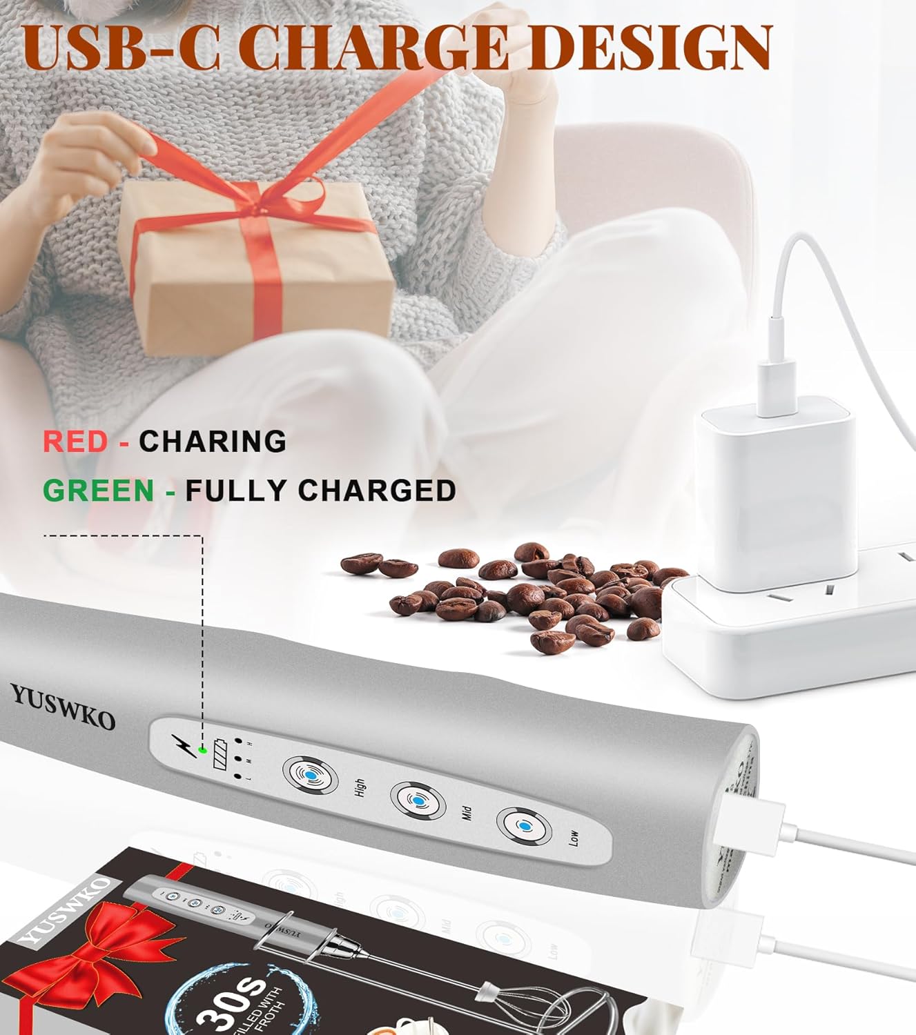 - 🎀【USB-C Rechargeable Milk Frother】This electric milk frother is powered by a built-in 1200mAh rechargeable battery, no need to replace any batteries, environmentally friendly and durable. Compared with the traditional Micro USB charging port, the USB-C charging port design makes it more compatible and faster charging. The charging indicator light is red when charging, and green when fully charged.