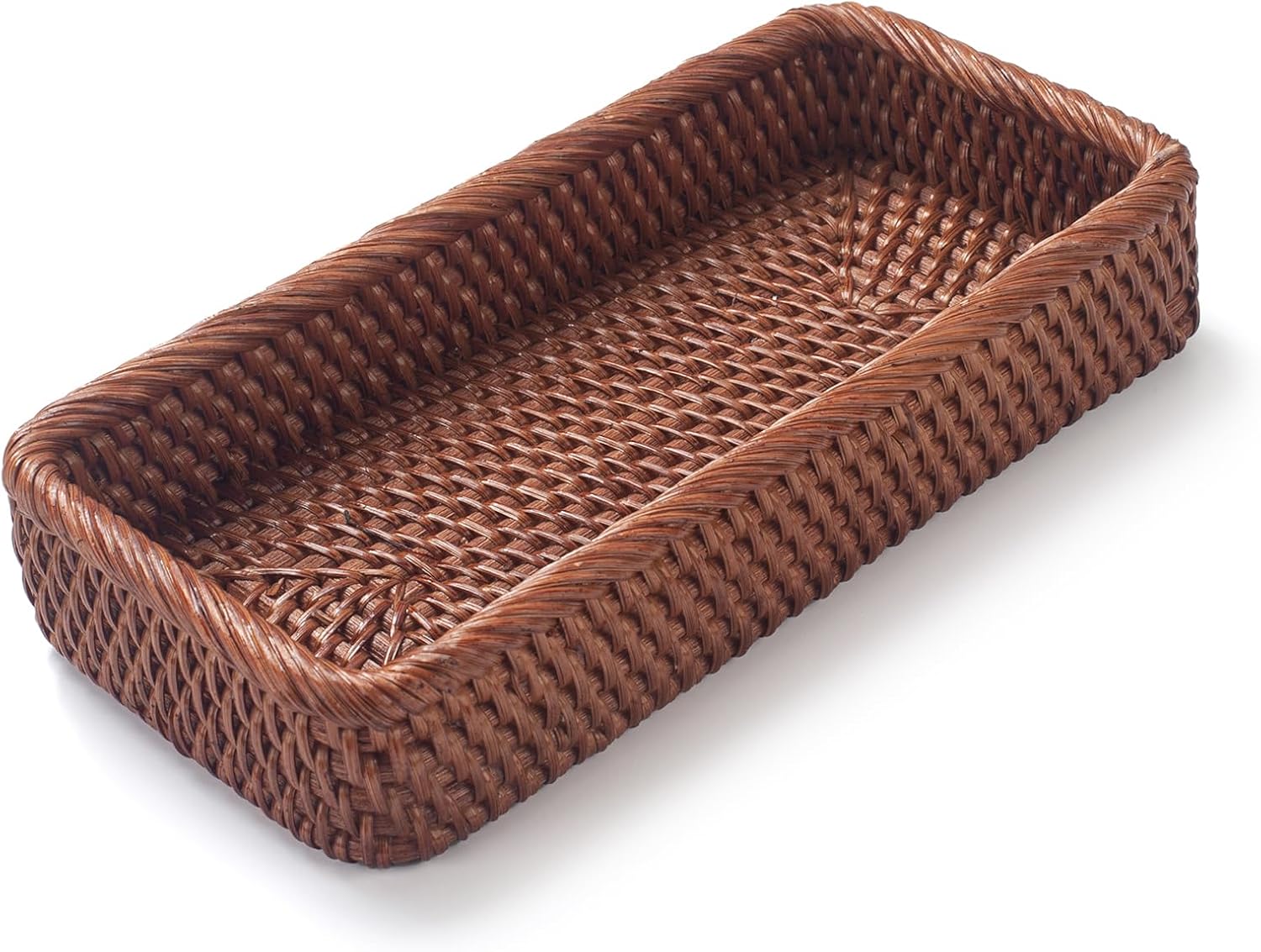 Rattan Bathroom Vanity Trays Toilet Tank Baskets Long Narrow Hand Towel Storage Basket for Storage, Decorative (Honey Brown 10.2 x 4.9 x 1.6 inch)