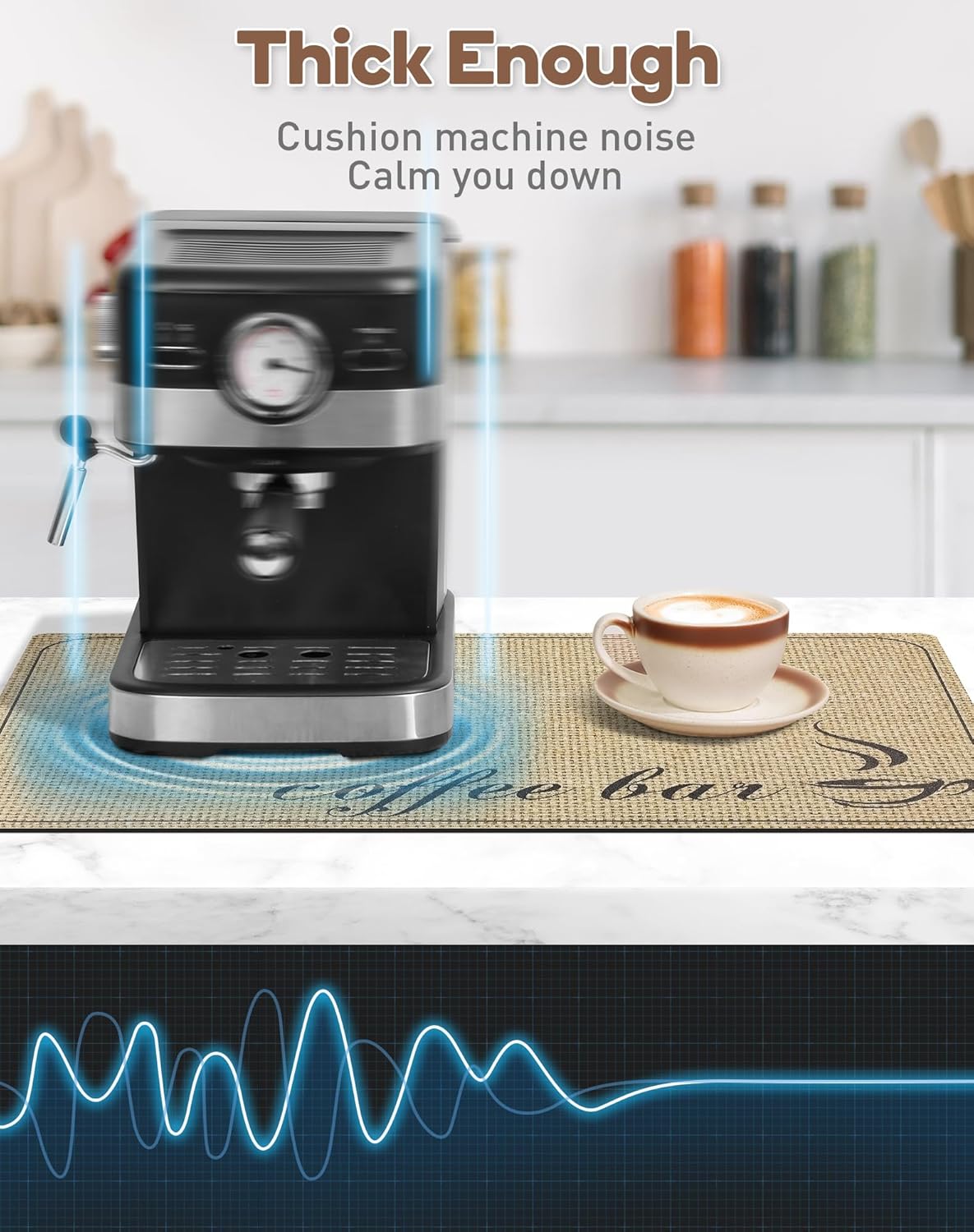 - Noise-dampening & Heat-resistant - Our coffee bar mat is 1/6" thick, which can effectively cushion coffee machine noise and reduce clinking sounds as cups touch the tabletop, ensuring you a tranquil and pleasant coffee experience. Additionally, it provides ample protection for your countertop, effectively shielding it from the heat of boiling water.