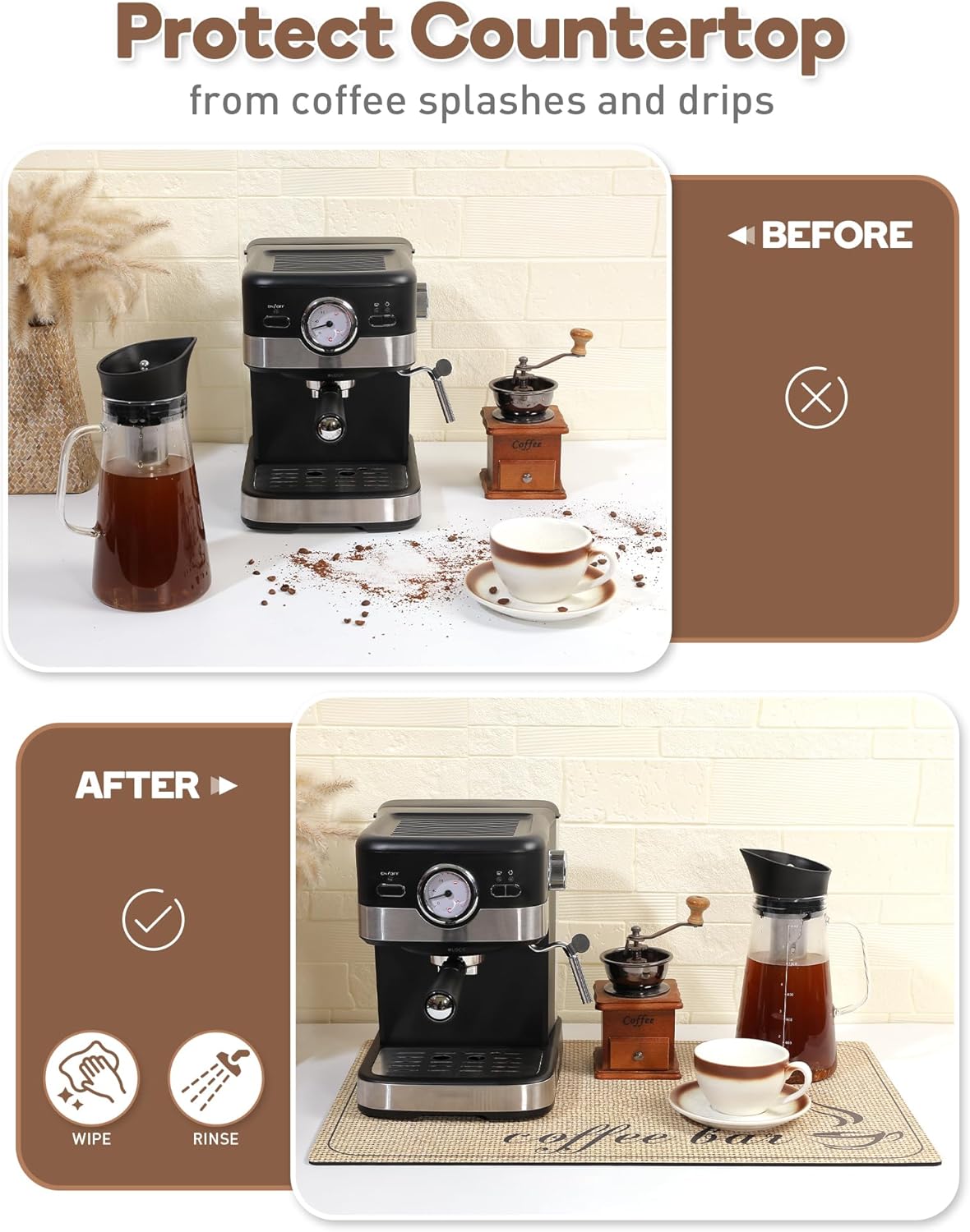 - Easy To Clean - Featuring a PU leathaire surface, this coffee mat is both stain-resistant and easy to maintain. You can simlpy wipe up the spills and grounds, or give it a quick rinse, and the mat will look as good as new. It provides excellent protection for your countertop against splashes and drips, effectively keeping it free from coffee stains.