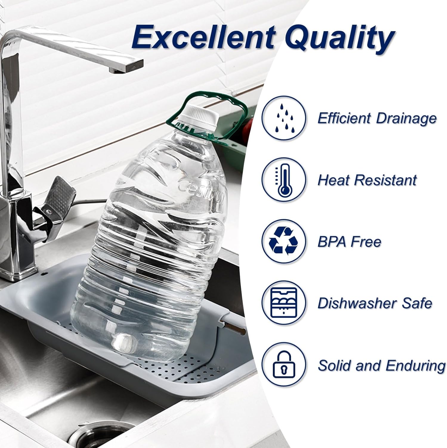 Extendable Sink Colander Strainer Basket - Wash Vegetables and Fruits, Drain Cooked Pasta and Dry Dishes - Adjustable Over the Sink Colander Collapsible Drainer Basket -Gray