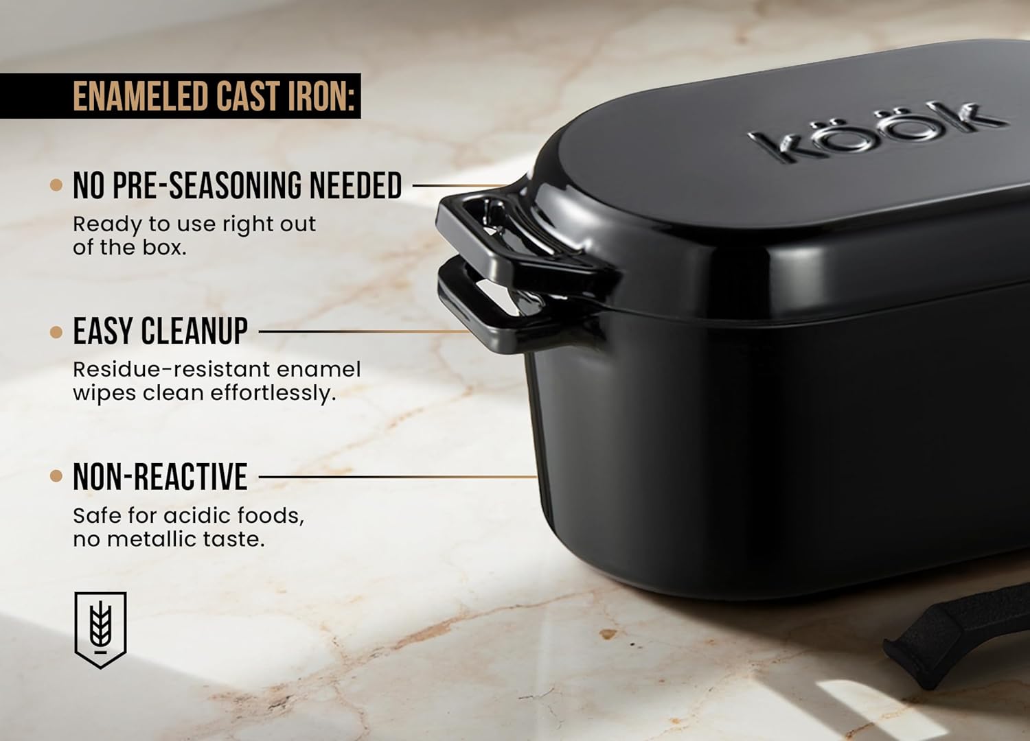KooK Dutch Oven, Oven for Sourdough Bread Baking, with Lid, Dual Handles, Enameled Cast Iron, includes Lid Lever, Great for Baking Bread, Cooking and Roasting, Dishwasher Safe, 3.4 Qt, Black