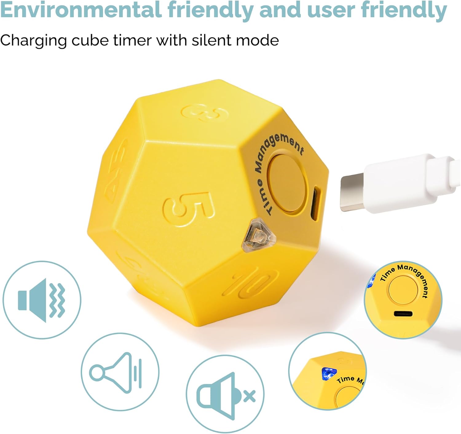 KADAMS Pomodoro Cube Timer Productivity-11 Preset Countdowns, Flip-to-Start Gravity Activation - Sound Vibrate Mute Rechargeable - Ideal for ADHD Kid Kitchen Classroom Cook Study Exercise - Yellow