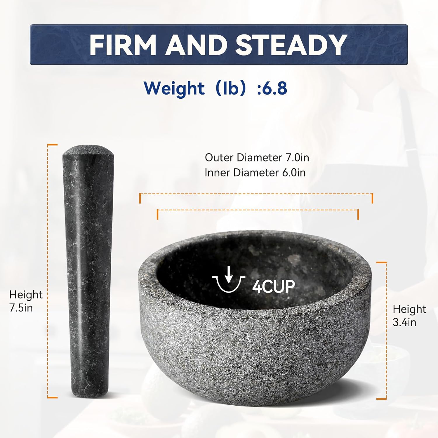 Koville Granite Mortar and Pestle Set, 7"-4 Cups Unpolished Stone Grinder Bowl for Guacamole, Salsa, Pill Crusher, Spice, Herb, Garlic, Nut, Heavy Duty Grinder for Kitchen(Angola Silver Black)