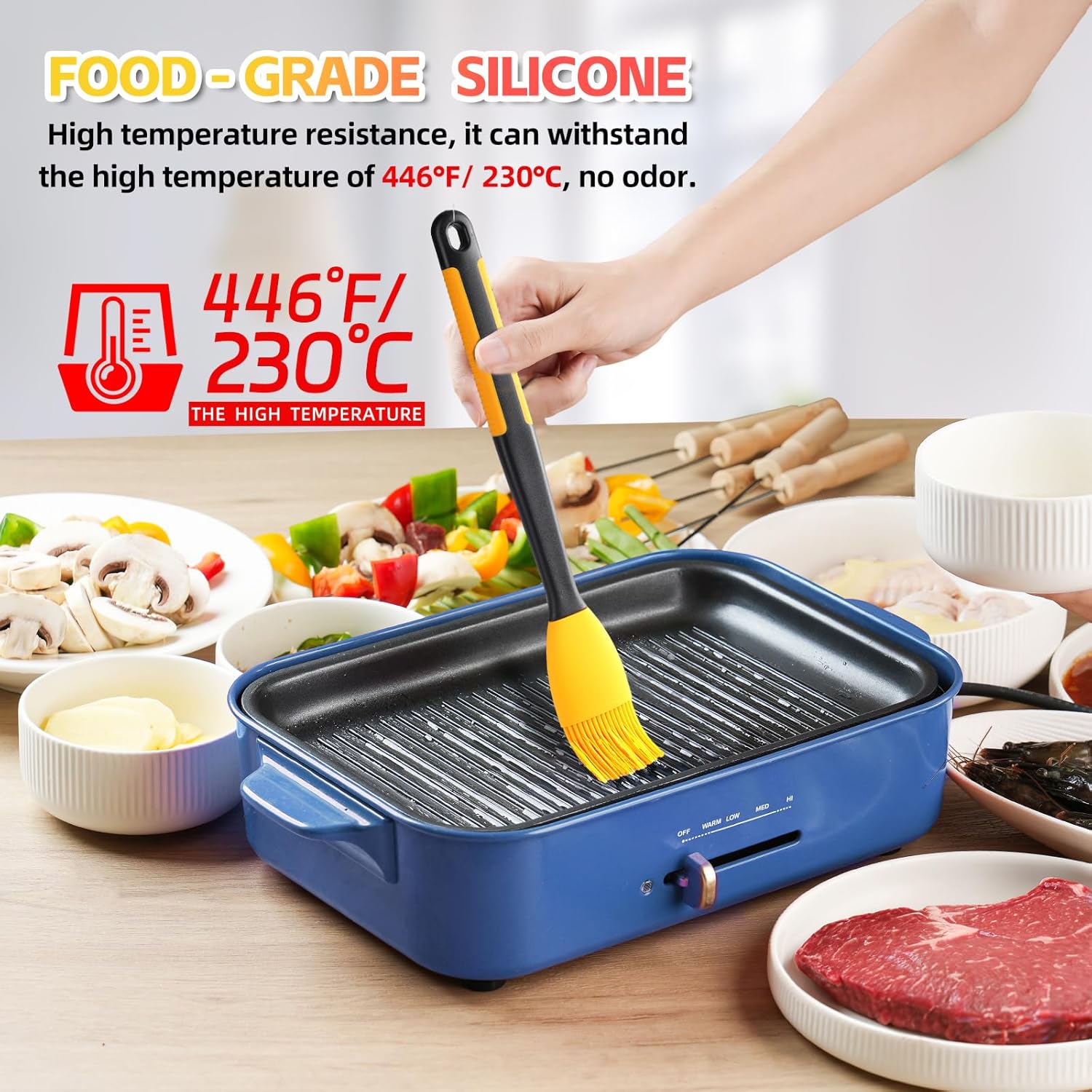 - 【HEAT RESISTANT FOOD GRADE SILICONE】Dishwasher safe cookware easy clean.It stands up well to high temps, withstand temperatures up to 446℉/230℃,made of high-quality food grade silicone,will never melt,discolor or shrink when grilling, basting or cooking .
