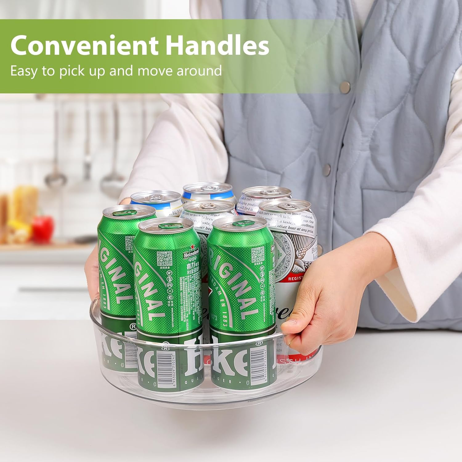 - High Sides & Handle Design- Our pantry lazy susan comes with raised edge, providing excellent support and preventing items from falling off even when the lazy susan is rotating quickly. And the built-in handles make it easy to carry and move to anywhere you want