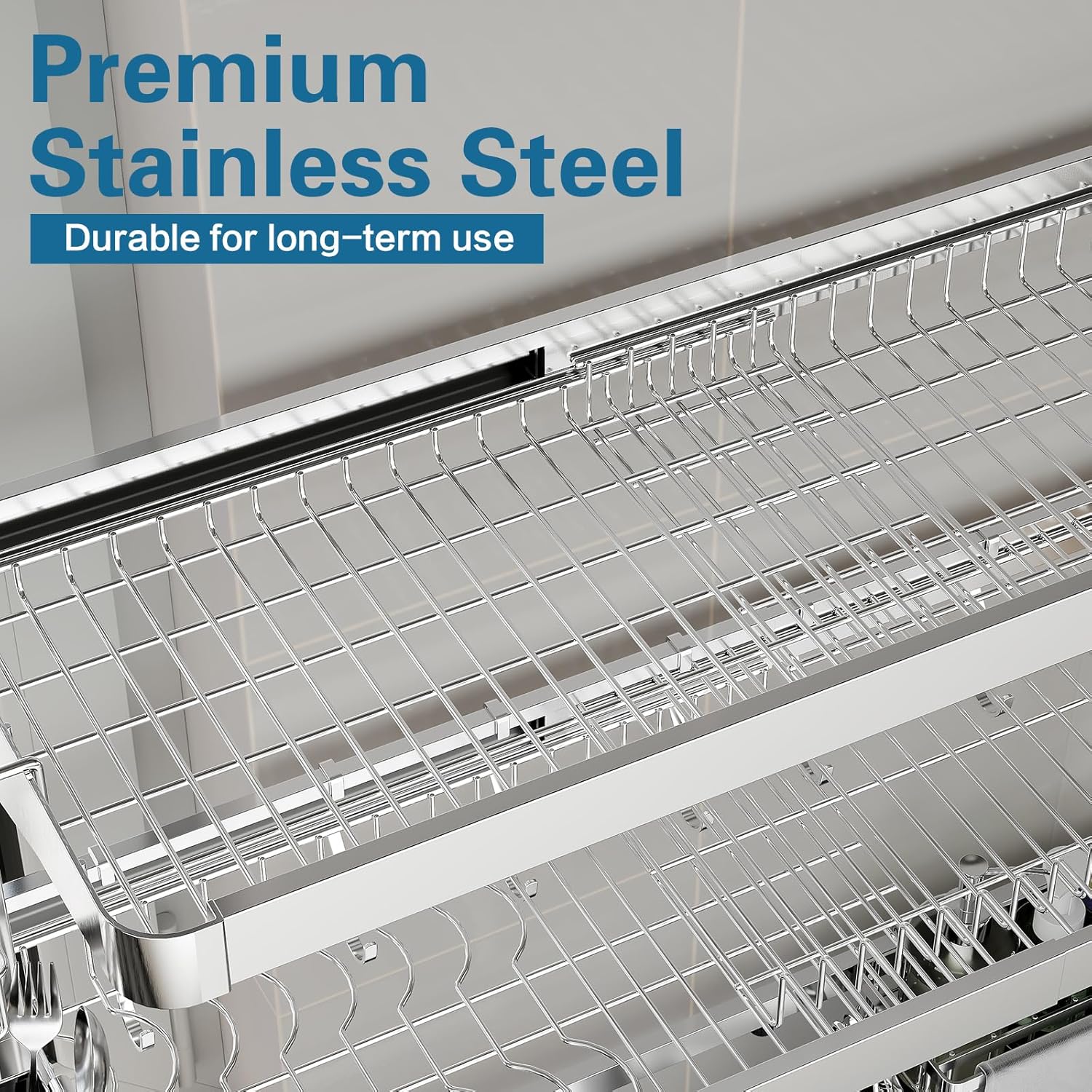 Over The Sink Dish Drying Rack,3 Tier Adjustable Length Full Stainless Steel Large Storage Kitchen Dish Rack,for Kitchen Counter Expandable Multifunctional Organizers,Silver (25.5'' to 37.6'')