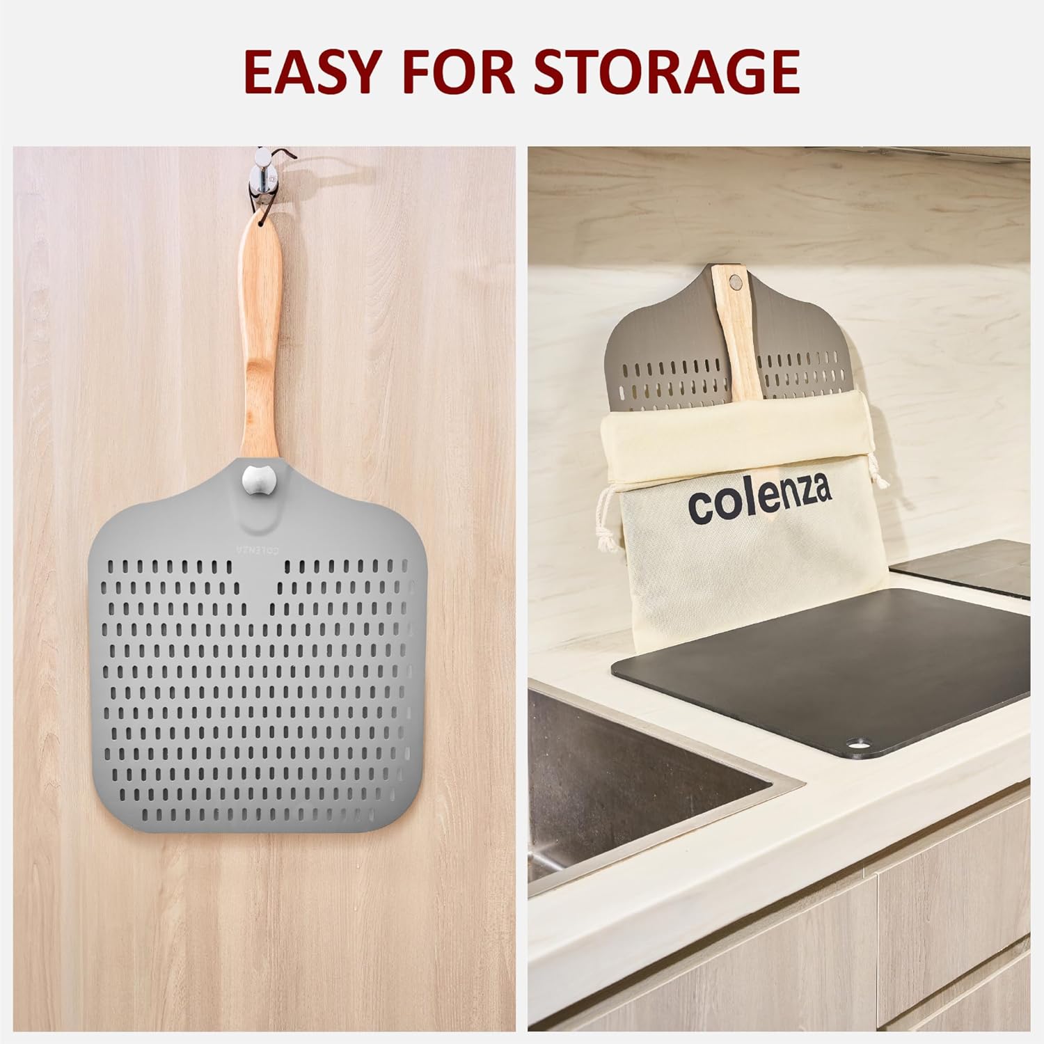 - ROTATING HANDLE AND CLOTH BAG FOR EASY STORAGE: set up/store your pizza peel without any tool! Simply loosen/tighten the handle of the pizza peel with just your hand and store your pizza peel in the cloth bag to prevent dust/scratches