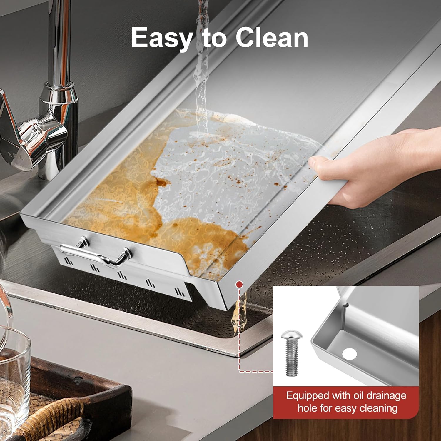 - GREASE GROOVE WITH HOLE, EASY TO CLEAN: Our essential griddle stove plate is equipped with grease grooves and drainage holes, allowing for the collection of grease/oil and food residues during cooking, making cleaning effortless.