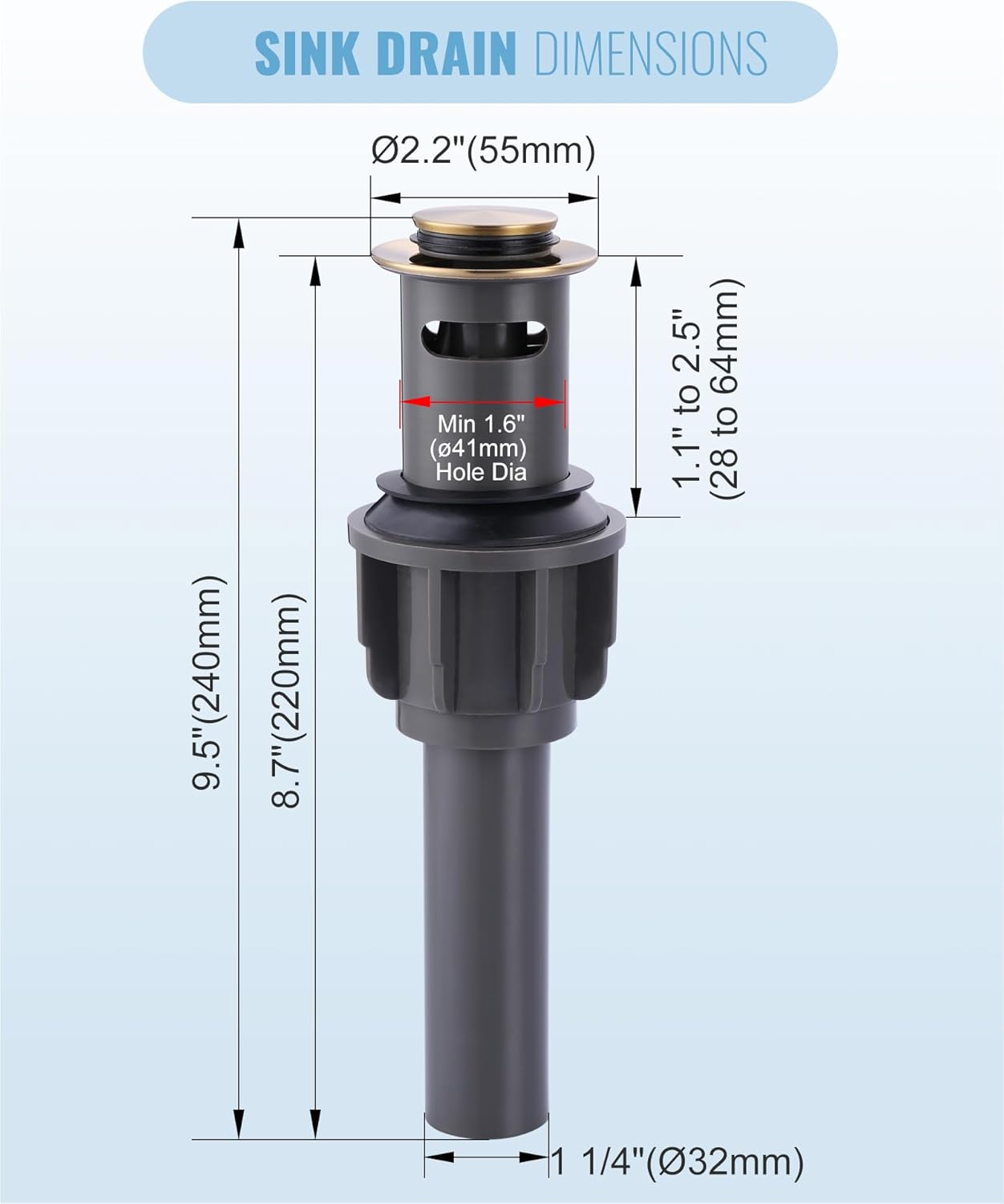 - 【Standard US Drain Hole】 - The bathroom pop up drain designed for sink without Overflow, Dimension: Overall length of the black sink drain: 9.5". Diameter of the pop-up stopper: 2.2". Diameter of the tailpiece nut: 1.25",Please check and confirm your size before purchasing.