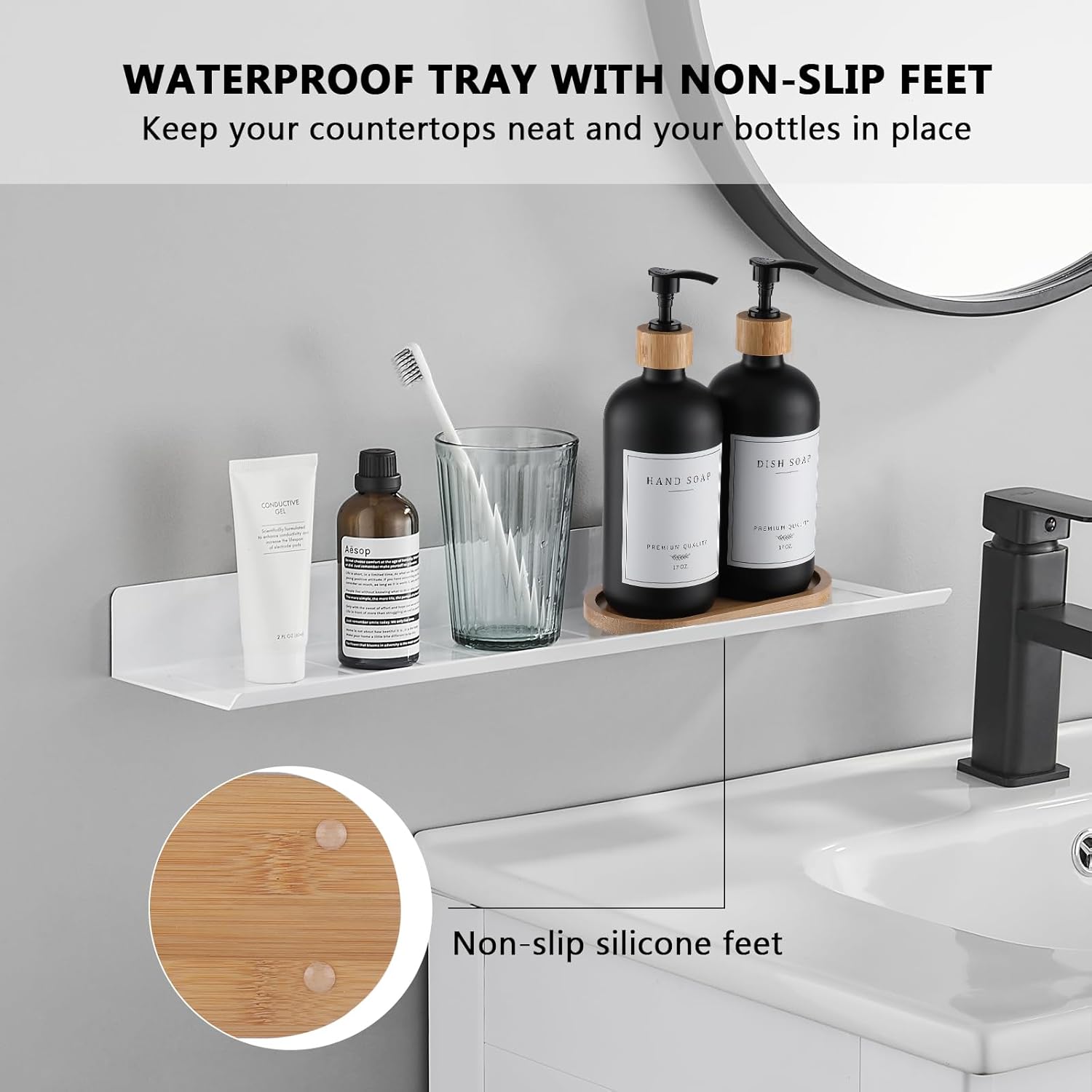 - Super organized and classy: Waterproof smooth tray keeps soap dispensers nicely together and keeps the counter more clutter-free, and doesn’t take up much room. The tray has a non-skid bottom keep bottle will stay in place during operation even when the counter is wet, also protect the counter from scratches. Add a touch of elegance to a boring sink area, get compliments about it whenever guests are over. ADD TO CART now.