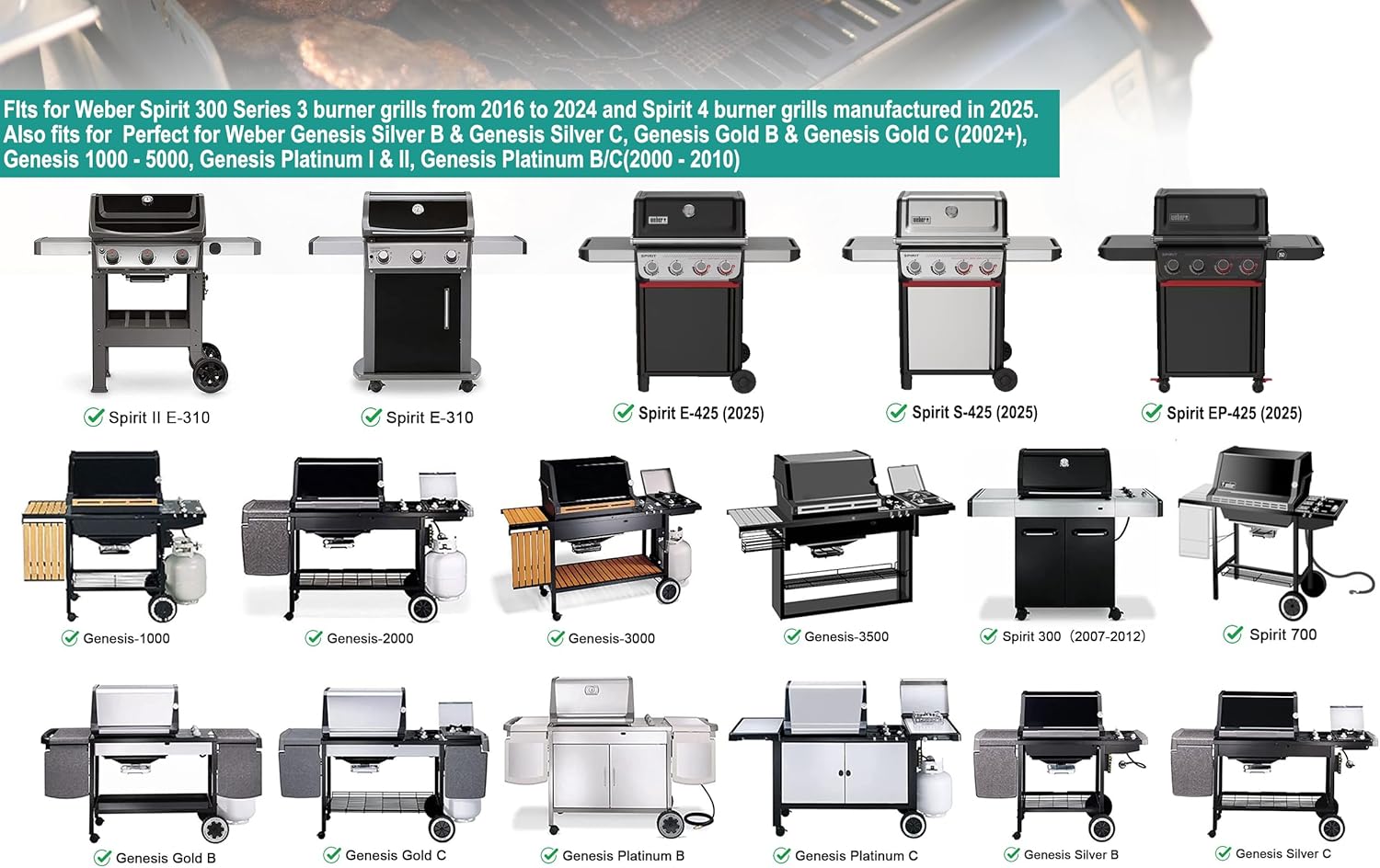 - 【Perfect for Weber Spirit I & GS4 Spirit II 300 Series 】Compatible with Weber Spirit 300 series grills, such as Spirit E-310 Spirit E-320 Spirit E-330, Spirit S-310 Spirit E-320 Spirit E-330, Spirit II E-310 Spirit II S-310, Spirit 700 Spirit 900.【Perfect for Weber Spirit 4 Burner Grill (2025)】Spirit E-425 (2025), Spirit E-435 (2025), Spirit S-425 (2025), Spirit EP-425 (2025).