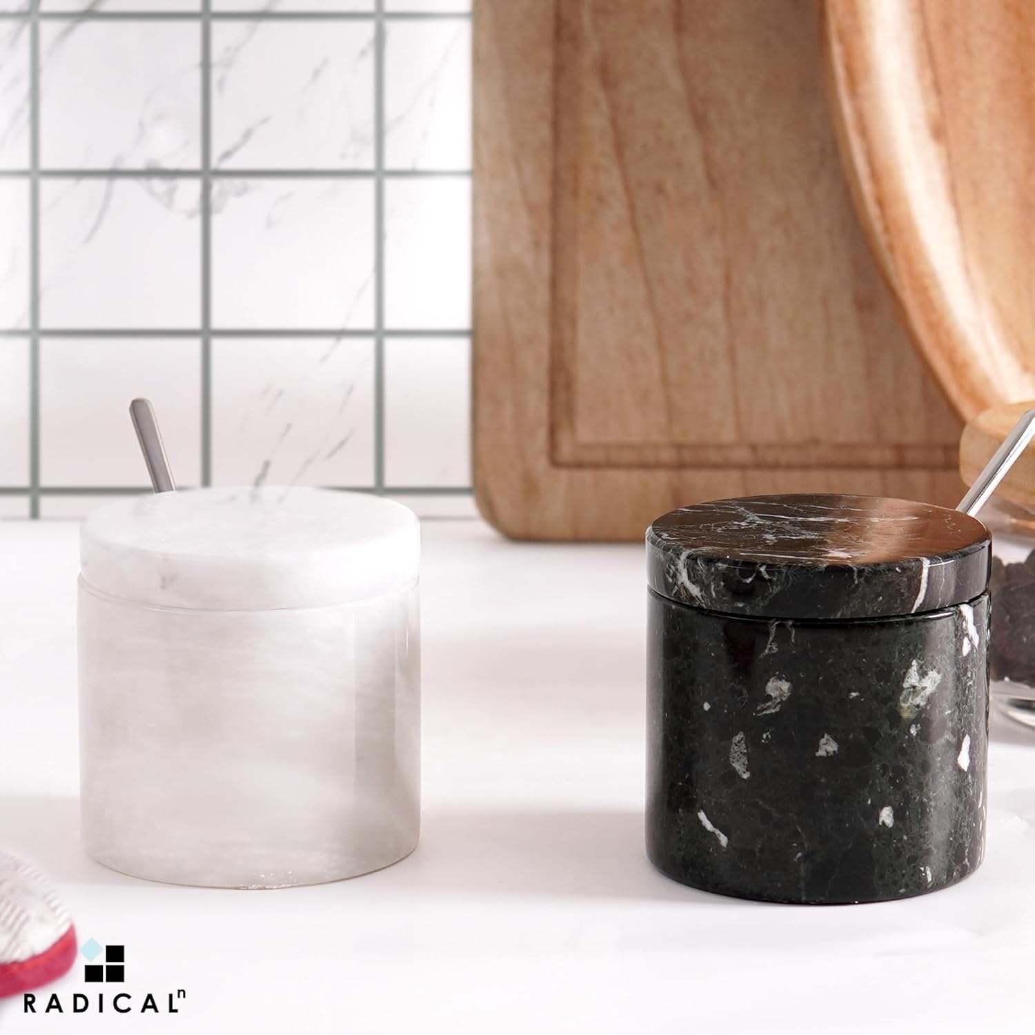 Radicaln Marble Salt Cellar With Lid and Tray 3" Inch Black and White Salt Container, Set of 2 Seasoning Jars, Spice Storage Container and Salt Bowl for Kitchen Countertop