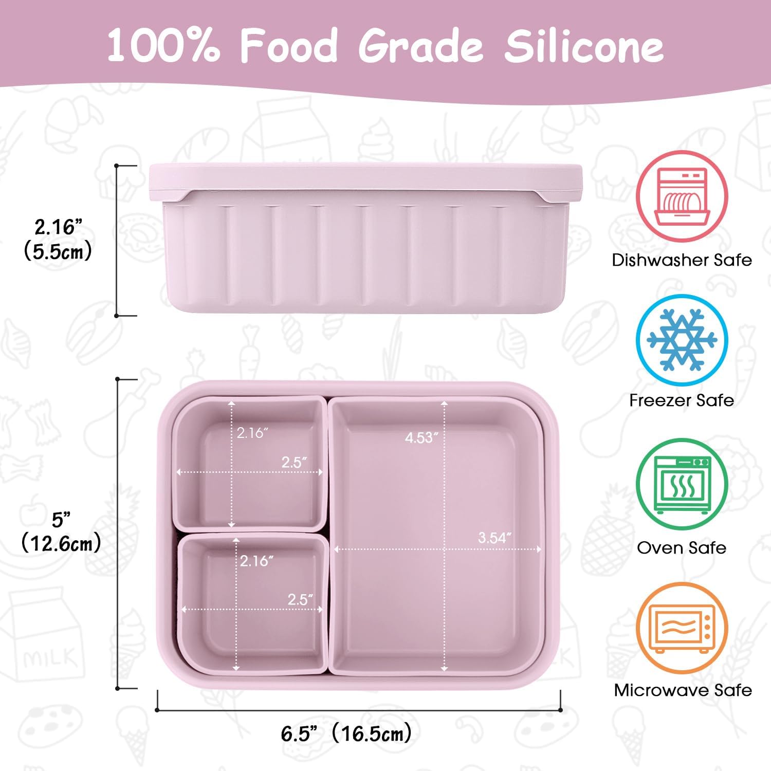- 【Say Goodbye to Mess】The silicone bento box lunchbox for Kids has individual compartment to keep food neat and separate. The leak proof silicone lids seal tightly around the lip of the container and ensure that the box remains tightly sealed during transport, preventing any spills or accidents. Easy to open and close for little fingers. Meanwhile,anti-slip design make the silicone bento box more safe