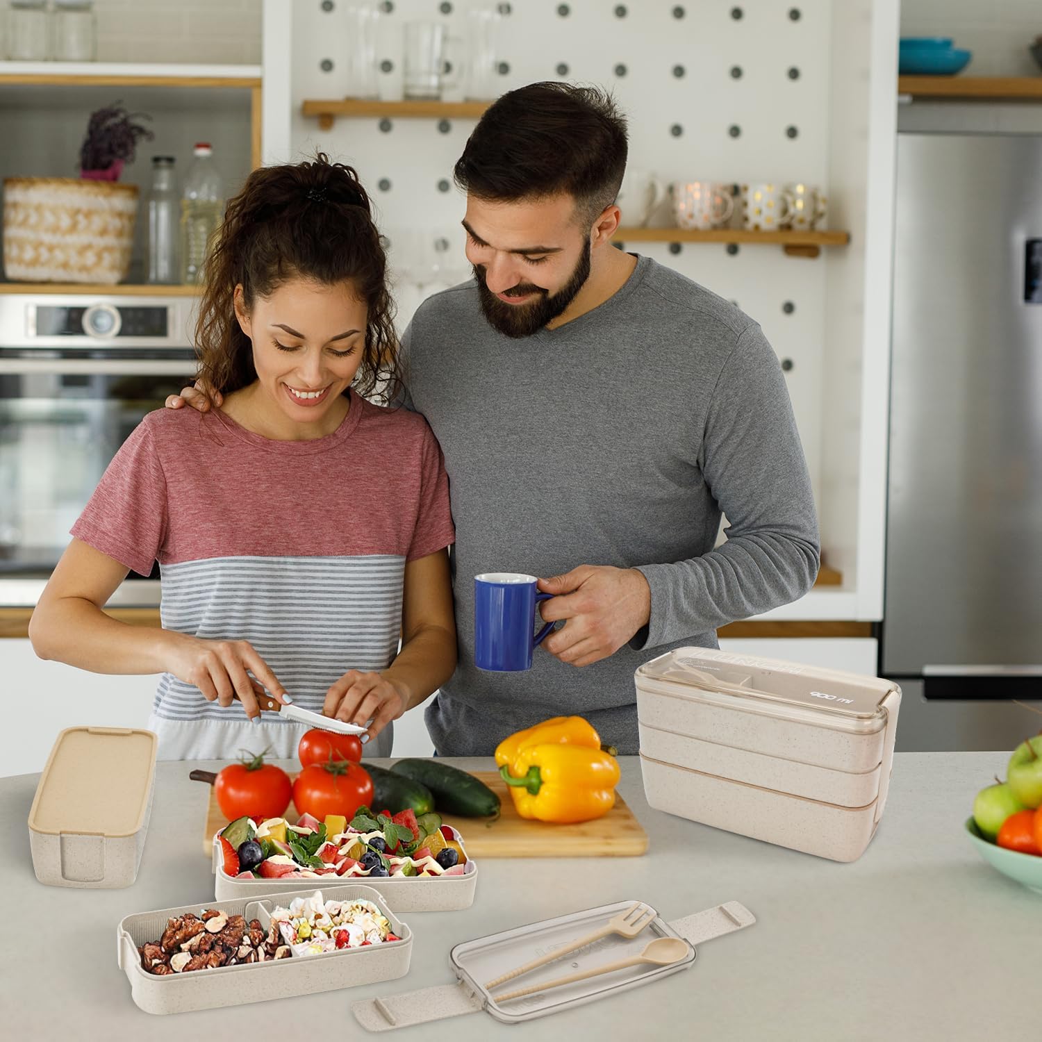 Bento Box Adult Lunch Box, Stackable 3-In-1 Compartment Bento Containers Kit with Spoon&Fork, Wheat Straw Meal Prep Containers Beige