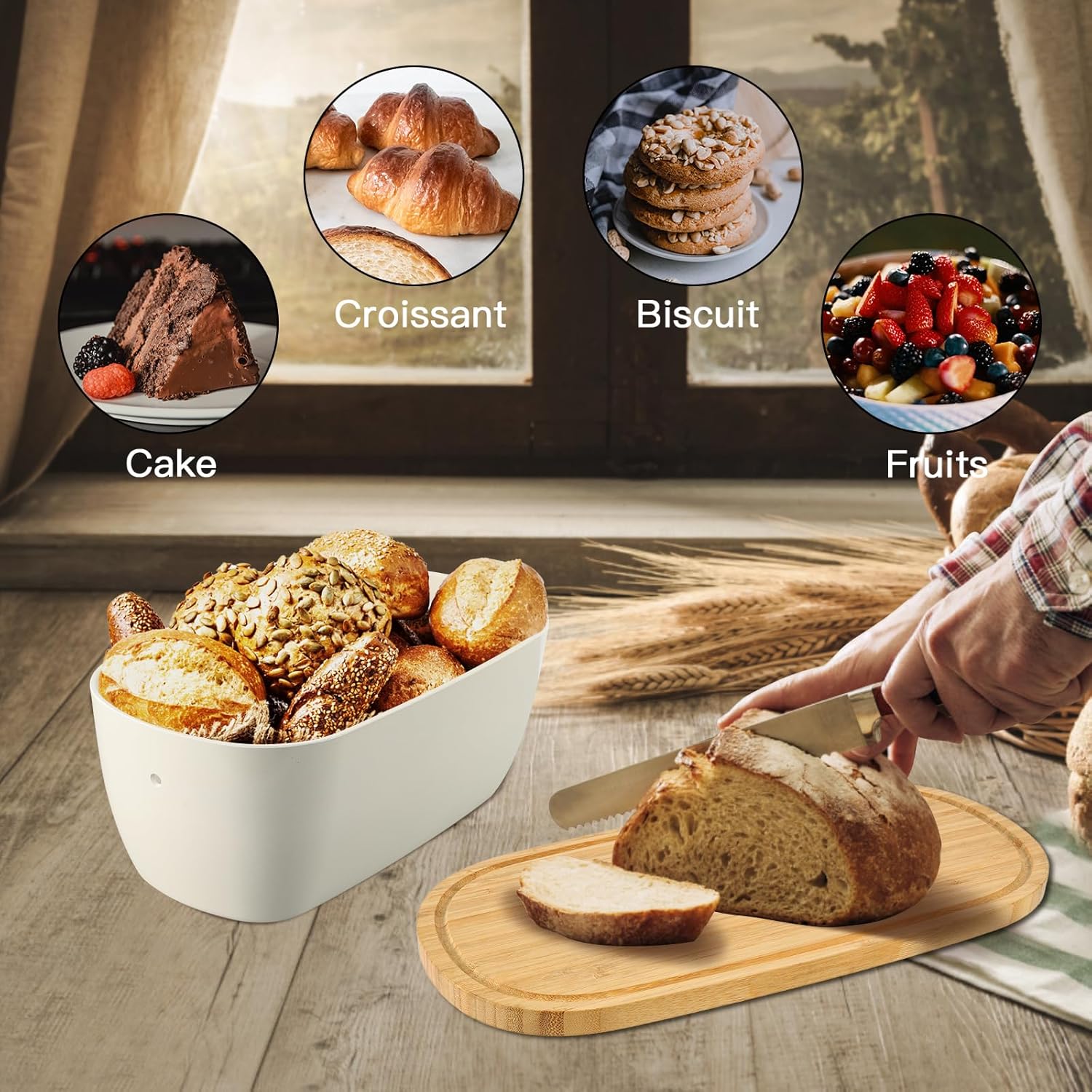 - Dual-Purpose Bamboo Lid:The sturdy bamboo lid acts as a cutting board (front) with a juice groove to catch liquids and a crumb-collecting surface (back). Perfect for slicing fruits, veggies, or serving bread and cheese.