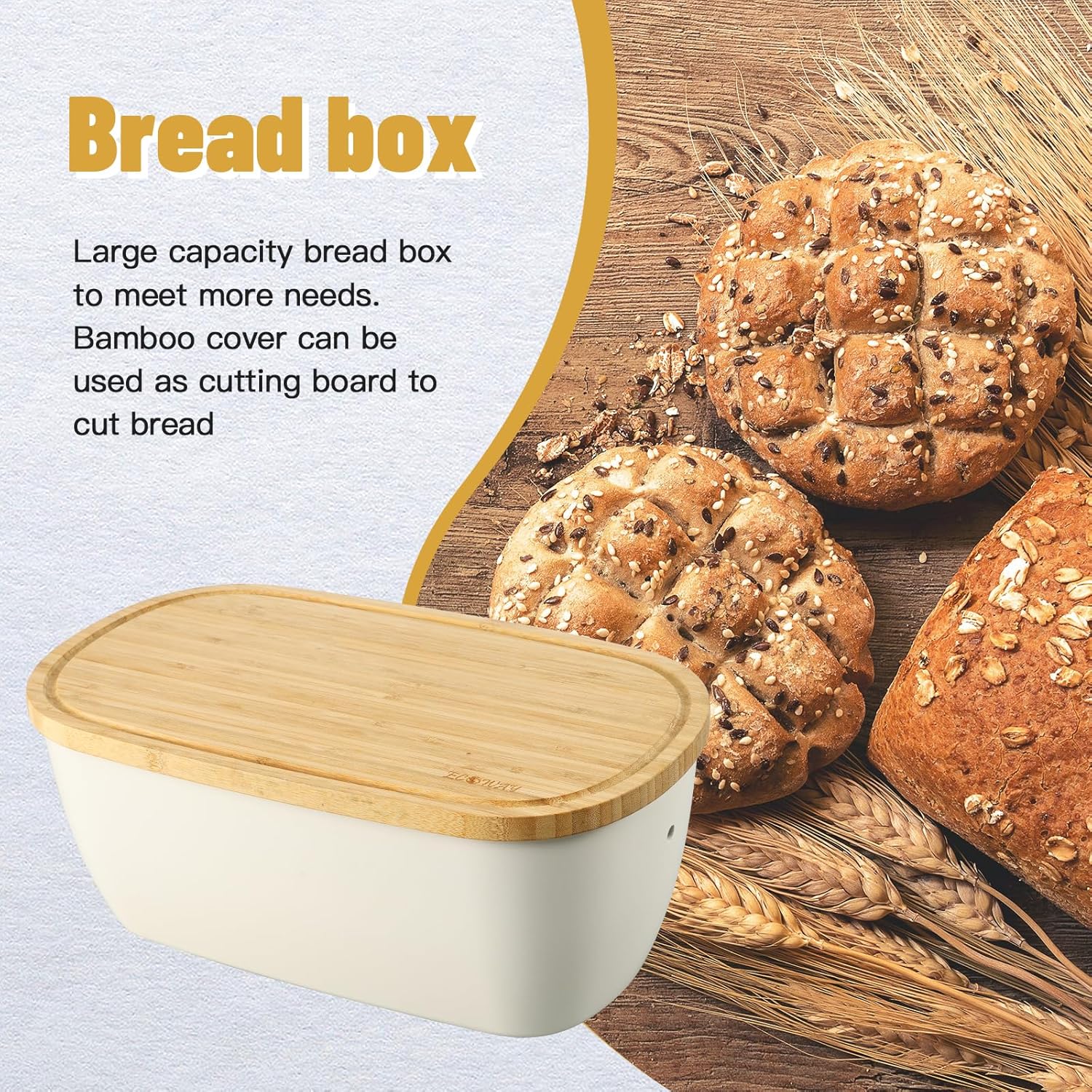 Bread Box for Kitchen Countertop - Bamboo Fiber Bread Bin with Reversible Cutting Board Lid, Juice Groove - Ventilated, Multi-Functional Storage Keeper for Freshness (14.2x7.8x5.5In, White)