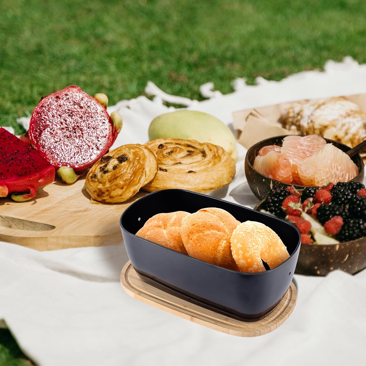 Bread Box for Kitchen Countertop - Bamboo Fiber Bread Bin with Reversible Cutting Board Lid, Juice Groove - Ventilated, Multi-Functional Storage Keeper for Freshness (14.2x7.8x5.5In, Black)