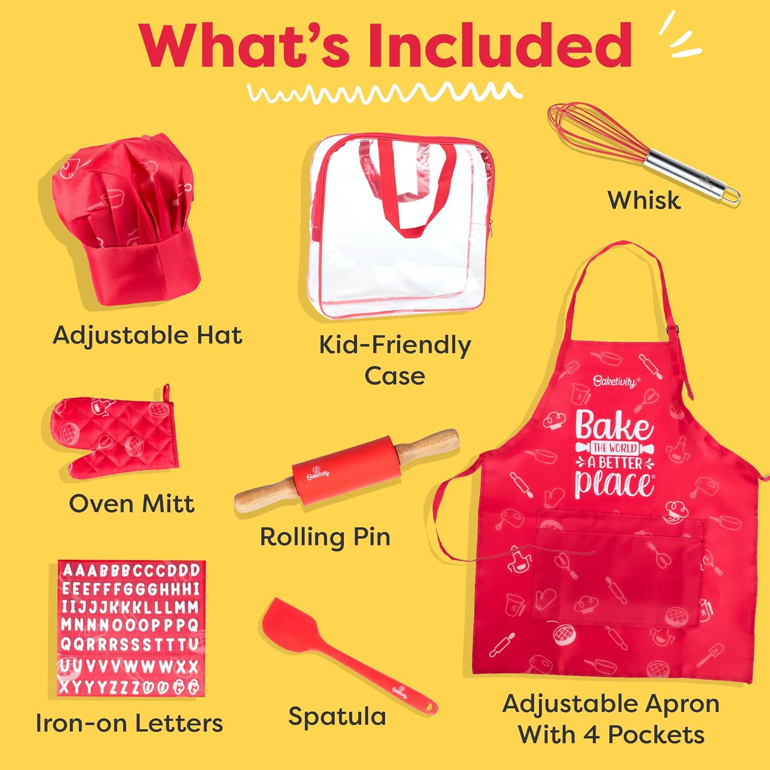 - ๐ ๐ฎ๐ง ๐๐ง๐ ๐๐๐๐๐ญ๐ฒ ๐๐๐๐ฎ๐ซ๐๐ - This Baketivity kids apron and chef hat kit brings together baking, quality, and safety. Every kitchen tool is made of durable, high-quality, BPA-free materials for a worry-free baking experience.