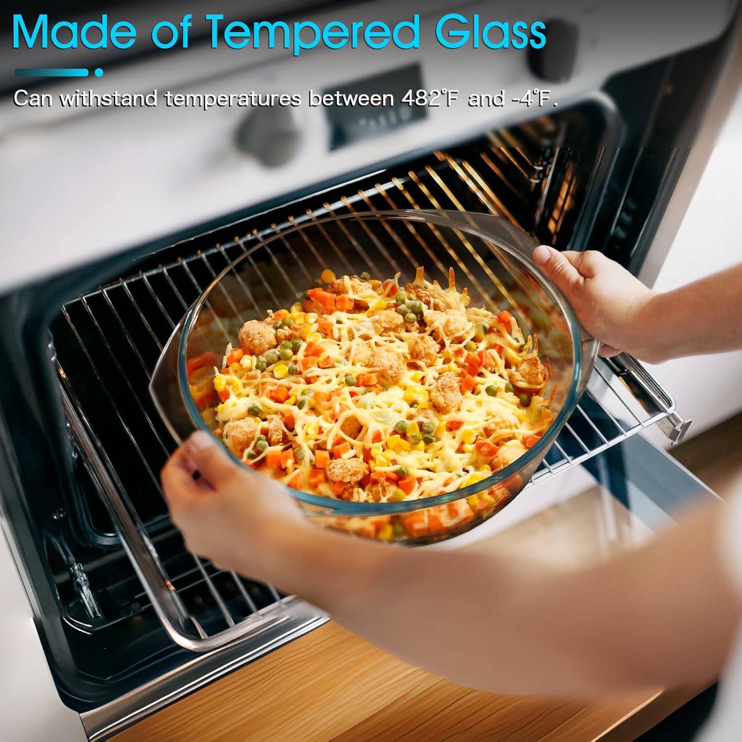 - 【Large Capacity】With a generous capacity of 3 liters, this round glass casserole dish allows you to cook large portions of food, perfect for family meals or gatherings. It provides ample space to prepare your favorite recipes and can easily accommodate multiple servings. Whether you're cooking casserole,baked potatoes, or a savory stew, this dish has the capacity to handle it all.