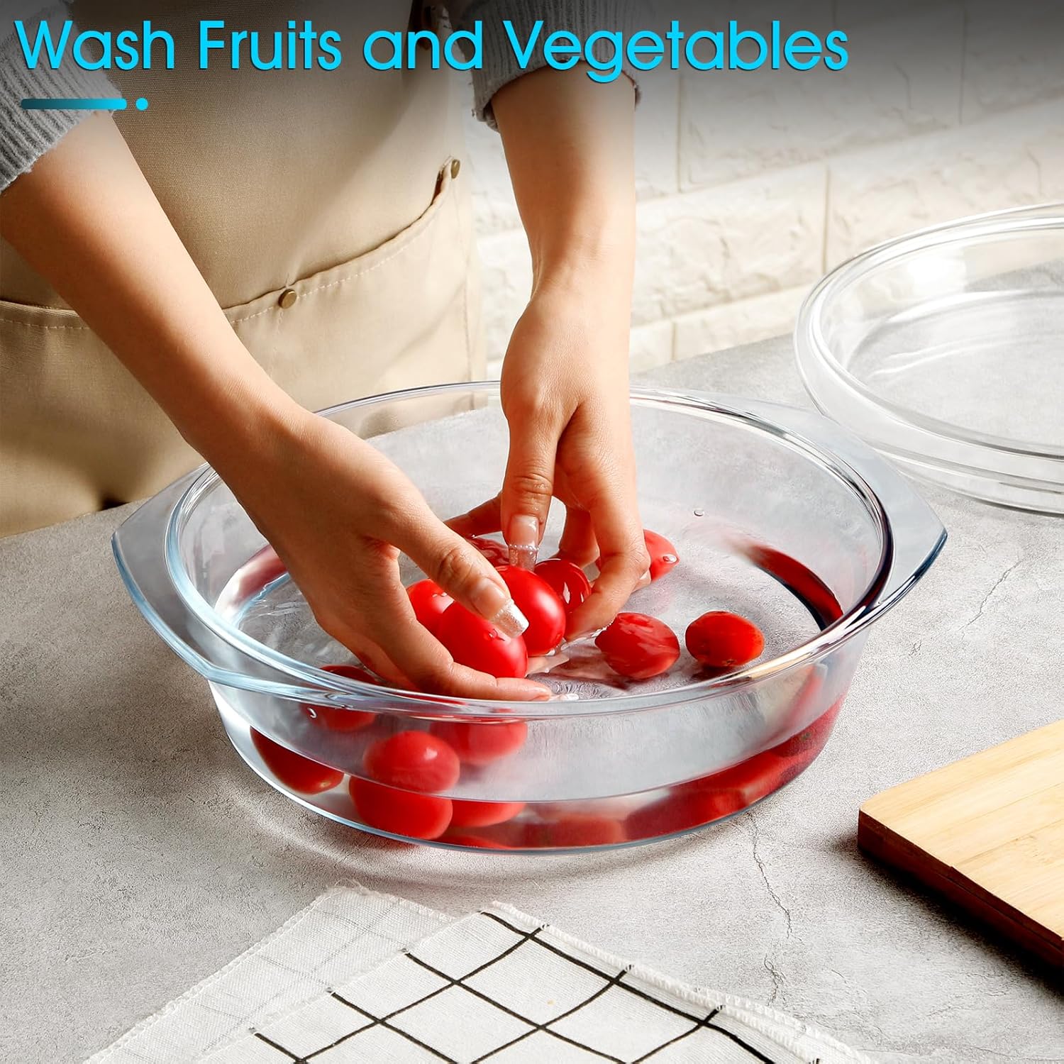 - 【Made From Tempered Glass】Round glass casserole dish can withstand temperatures between 482° F and -4° F without worrying about thermal shock breaking it. Note handle-to-handle width: 12inch. May not fit small microwaves. Please measure your microwave interior before use if needed.