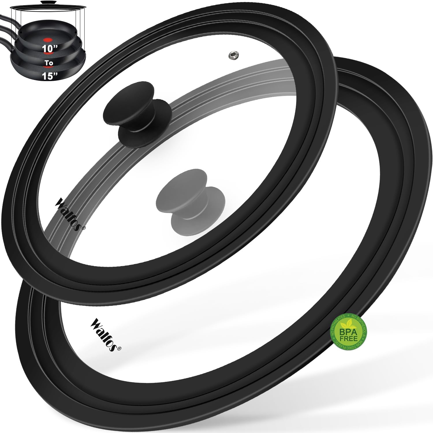 Walfos 2 Pcs Universal Pot Lids, Frying Pan Lid with Heat Resistant Silicone Rim, Fits All 10", 11", 12" to 13", 14", 15" Diameter Cookware, Pots, Pans and Skillets, BPA Free and Dishwasher Safe