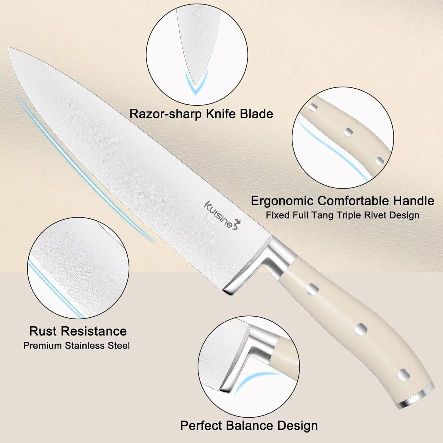 Kuisine Chef Knife Set,High Carbon Stainless Steel Sharp Knife Set Ergonomic Handle,Kitchen Knife Block Set with Built-in Sharpener(Ivory Pro,15PCS)