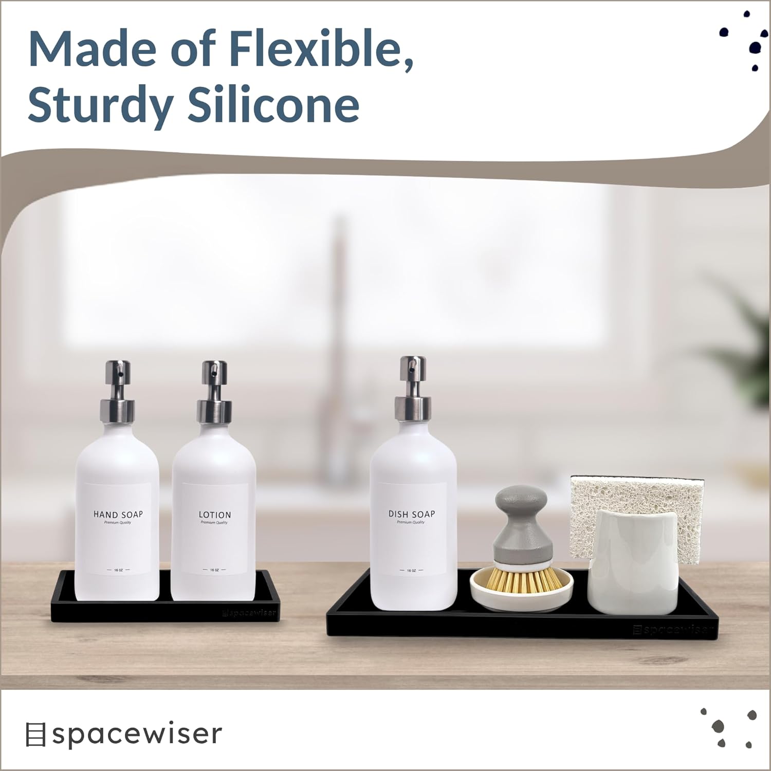 - Use Them Anywhere - Choose the endlessly useful and aesthetically pleasing black trays that work anywhere. Spacewiser Original Silicone Trays are made of premium food grade silicone, without the addition of potentially unsafe thickening and hardening agents or chemicals. They’re shatterproof, waterproof, slip-resistant, heat resistant to 425F, and dishwasher safe. They’re perfect as a bathroom tray, vanity tray or kitchen sink tray.