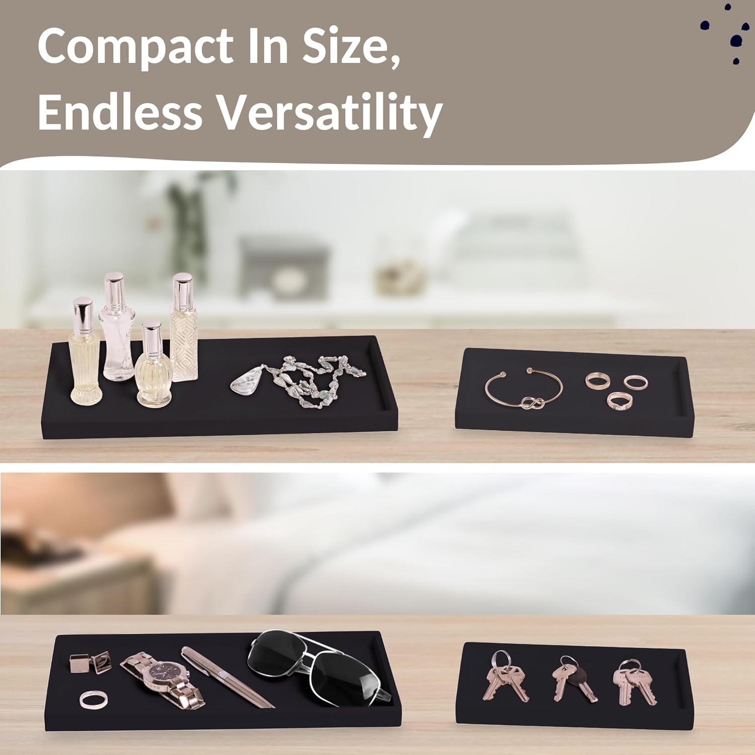- Thoughtfully Sized - The dimensions, combined with the gentle texture, make these trays perfect as a bathroom tray countertop organizer or bathroom soap tray - they’re ideal as a valet tray for men, jewelry tray, perfume tray, key tray or trinket tray. Heat resistant to 425 F, and with walls to catch spills, they’re perfect as a candle tray, kitchen spoon rest or tray for olive oil and condiments.