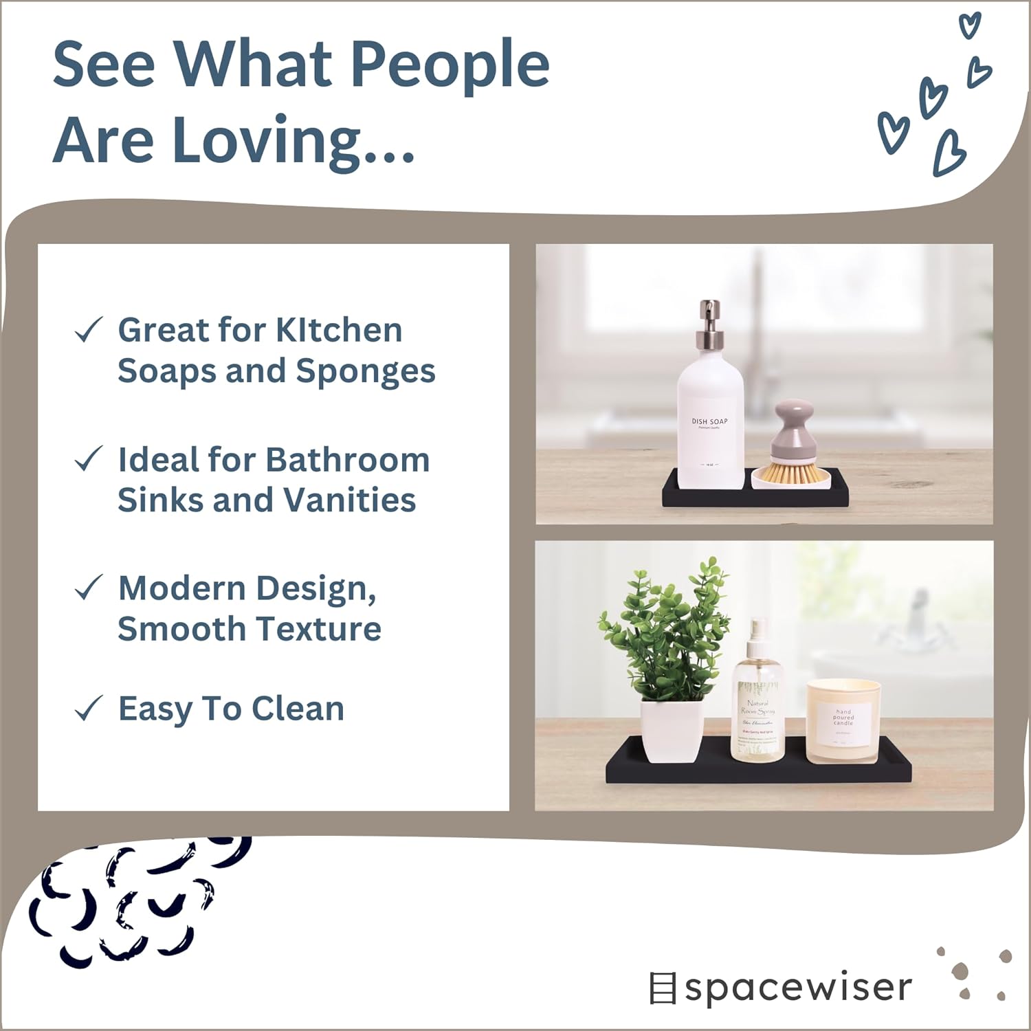 - Wet Areas, No Problem - These versatile trays are waterproof and won’t warp, discolor or peel. They’re dishwasher safe and excellent as a kitchen sink tray, black bathroom tray, black soap dish or black sink soap holder. They’re also shatterproof and great as a bathroom counter organizer, kitchen counter organizer or dish soap holder.