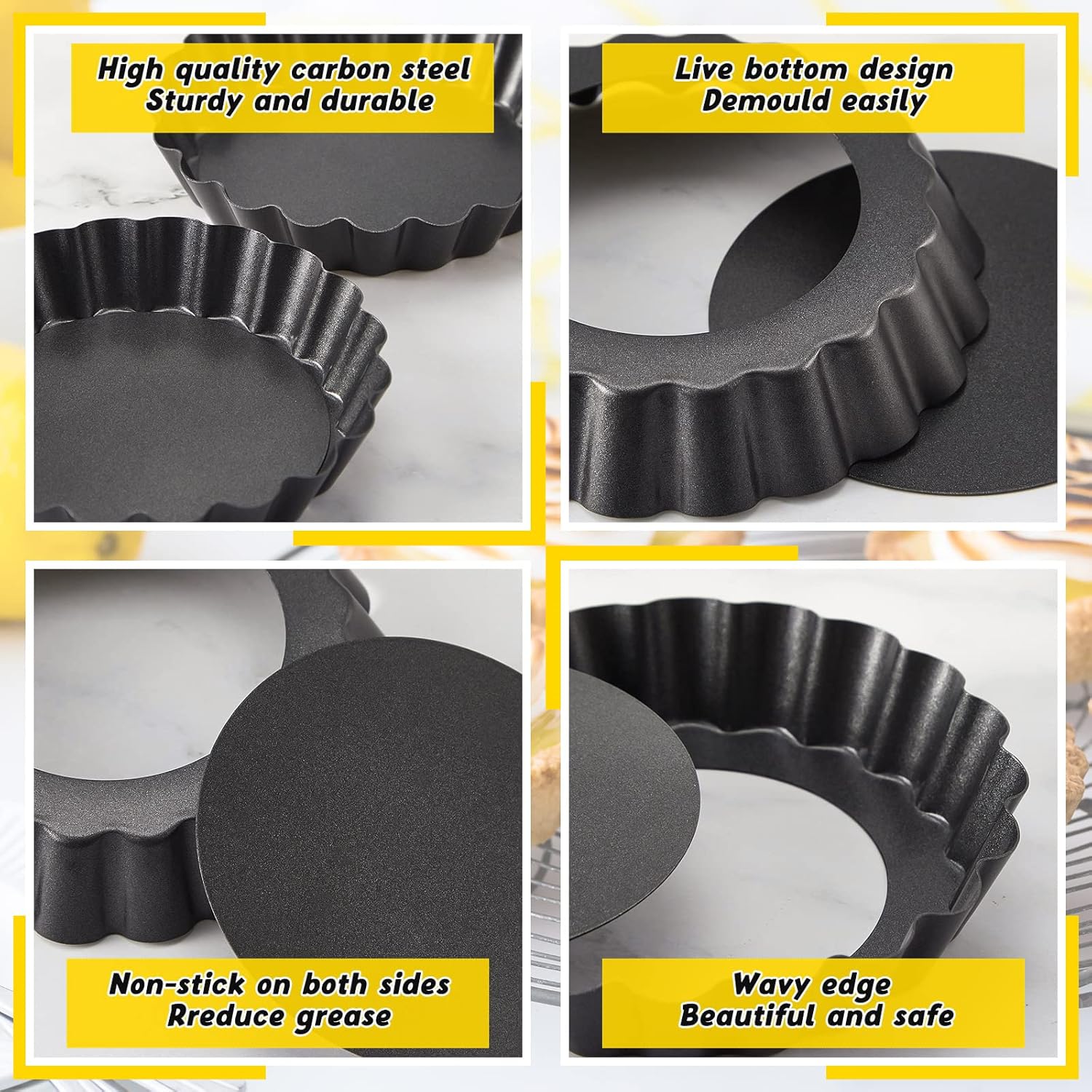 - Broadly Applicable: the pastry pans are nice for fruit tarts, small quiches, small pies, small tarts, mini lemon tarts, small pecan tarts, cheesecakes and more, suitable for restaurants, bakeries, buffets, weddings, Mother's Day, Valentine's Day, birthday parties, housewarming celebrations and other formal occasions