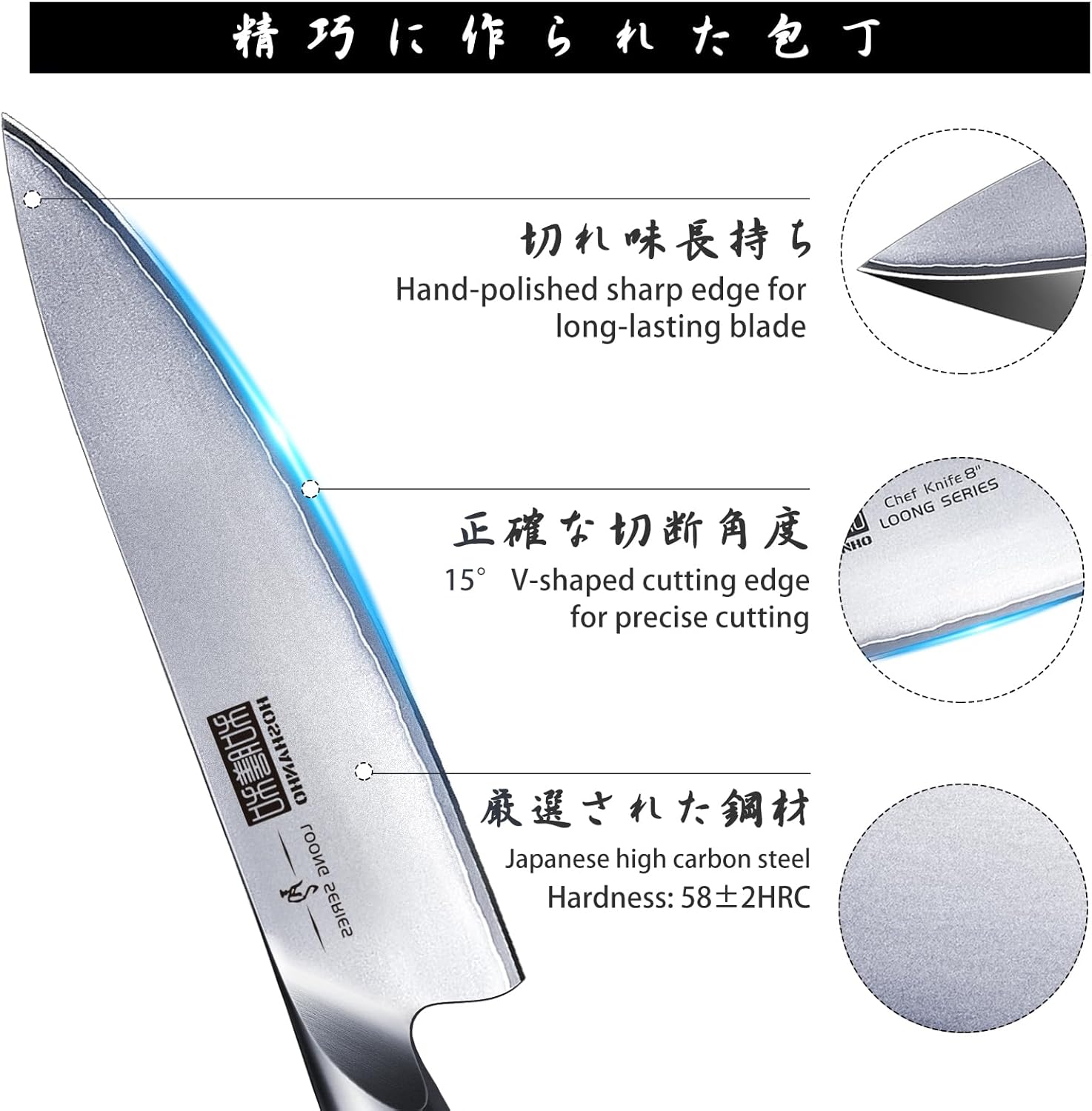 - 【Easy Care & Store】HOSHANHO chef knife set comes with a knife holder with a ventilation design at the bottom, which is suitable for long-term storage of knives; The knife block set also comes with a sharpening rod for daily maintenance and sharpness maintenance of knives