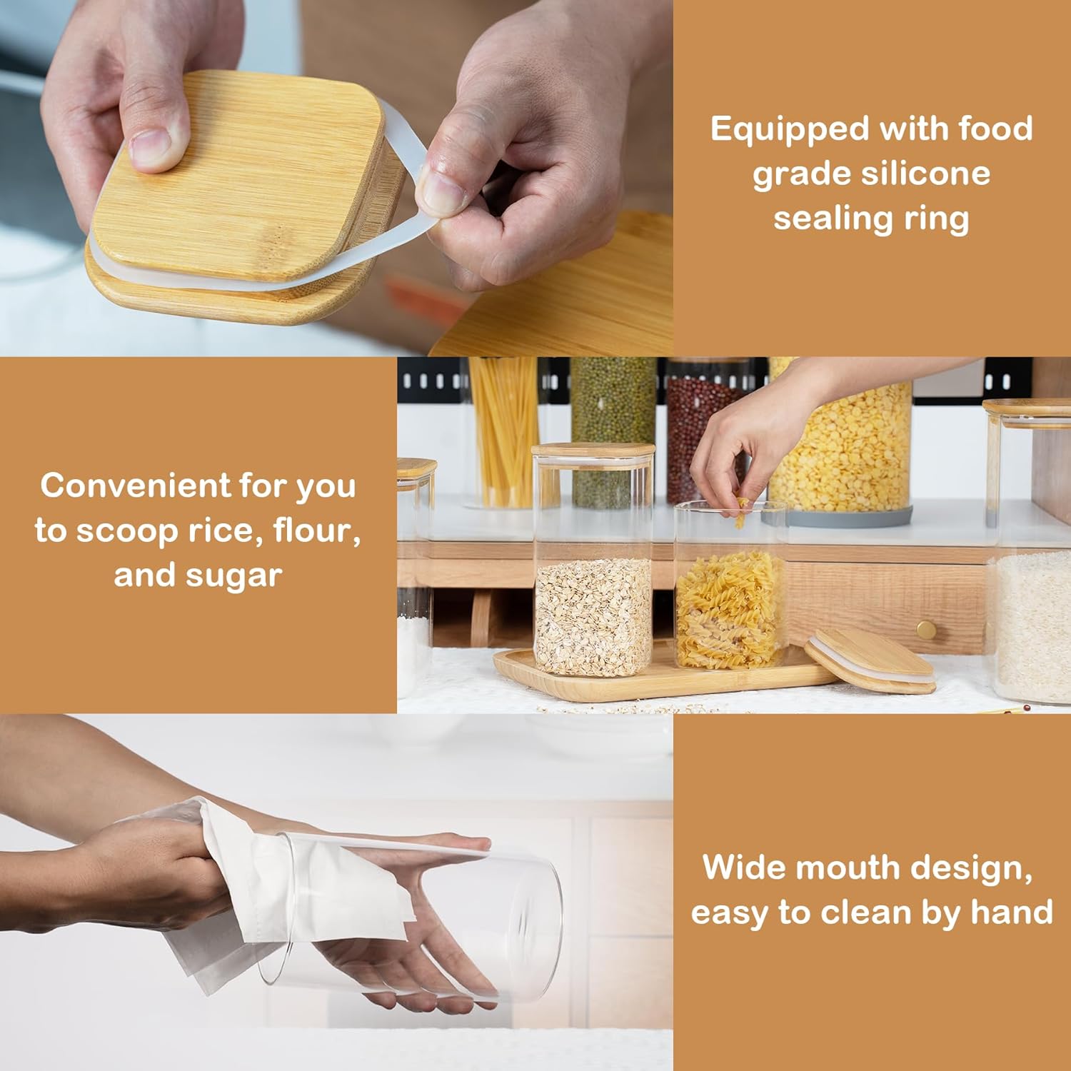- [Transparent jar]- Transparent square glass containers make your items visible, allowing you to clearly see the contents of the glass storage jar and the remaining stock, and then you can easily replenish the food that is about to run out.