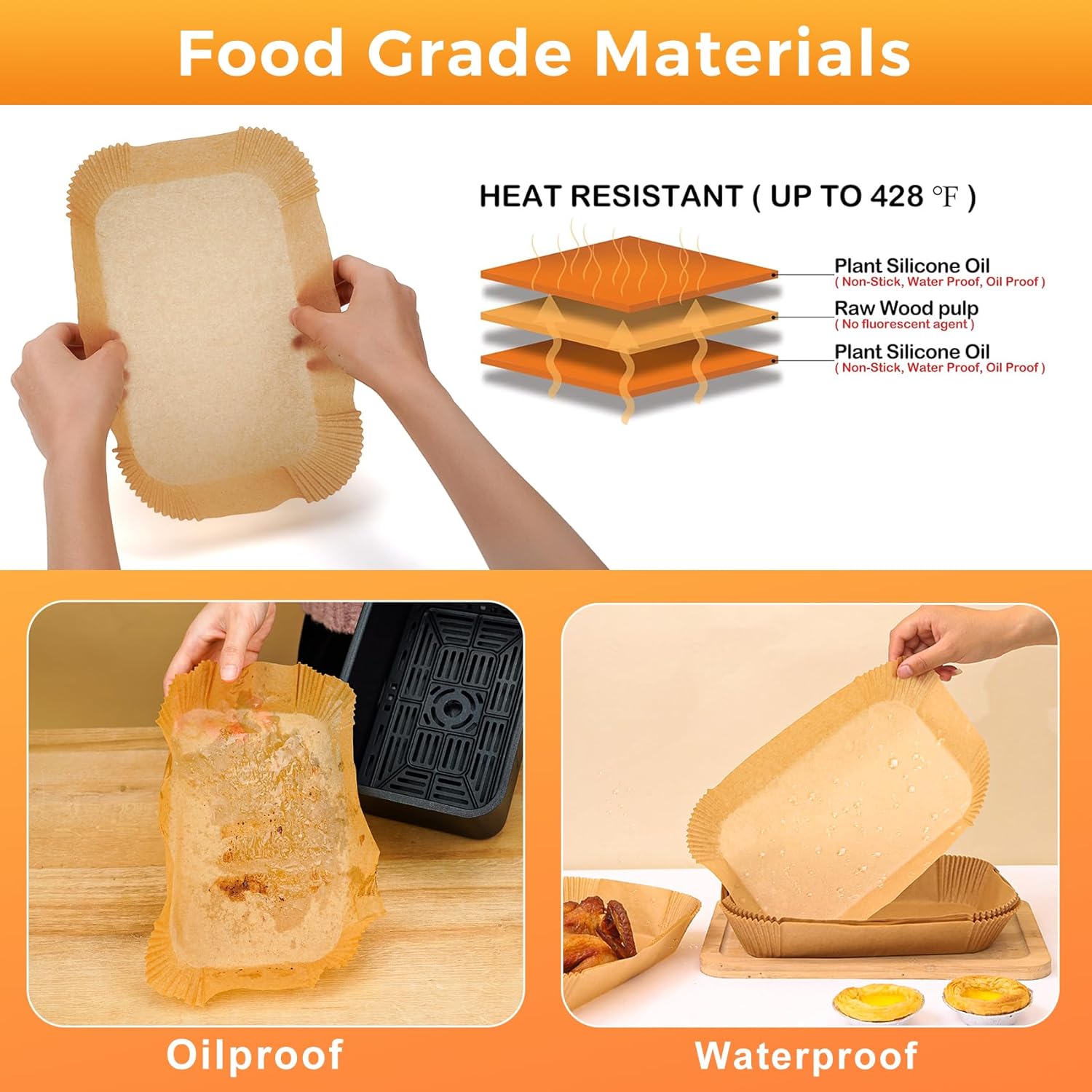 - Food Grade Materials: Rectangle air fryer paper liners are made of unbleached parchment with double-sided silicone oil coating, no fluorescent, BPA-free. These baking paper are no affection to the taste of food and the hot air circulation of air frying