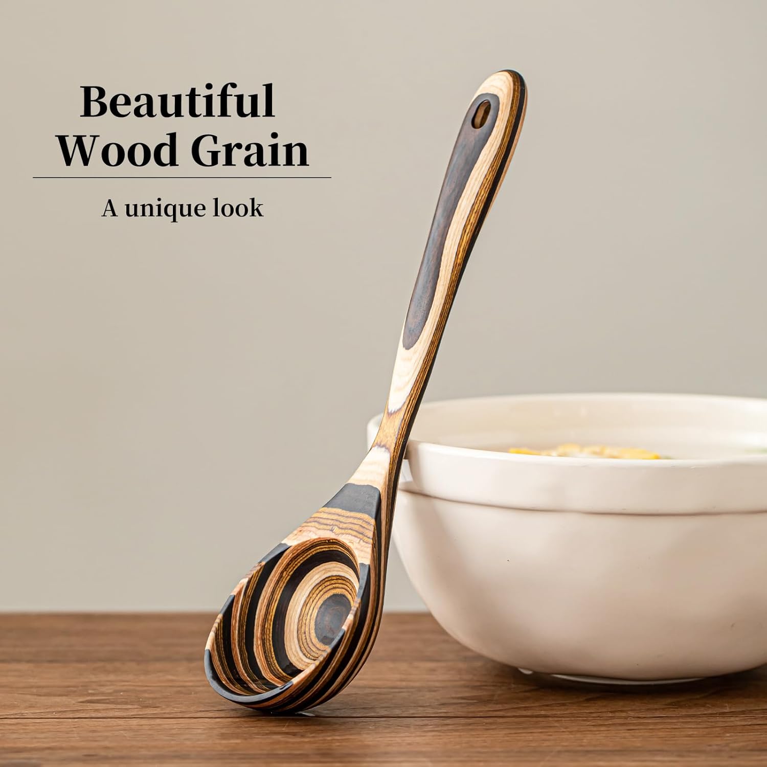 - Premium Pakkawood Ladle: Pakkawood is also made of wood, color wood powder is molded through high-density insulation board process Texture and color can be controlled by craft