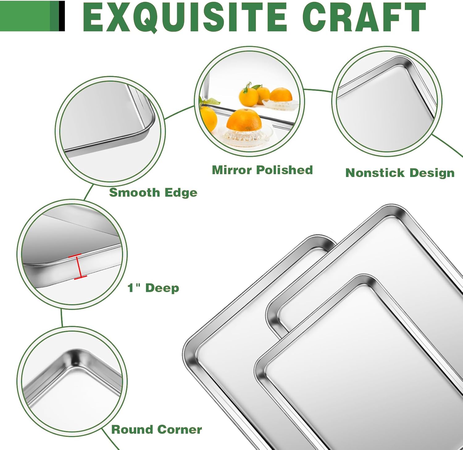 - High-Quality Stainless Steel: Our baking sheet is made of professional food grade high quality stainless steel, with a thickness of 0.8 mm, making it extremely sturdy and durable. And it can withstand temperatures up to 450Β°F, and the reinforced encapsulated steel edges prevent warping, ensuring that our baking pan remains perfectly shaped forever
