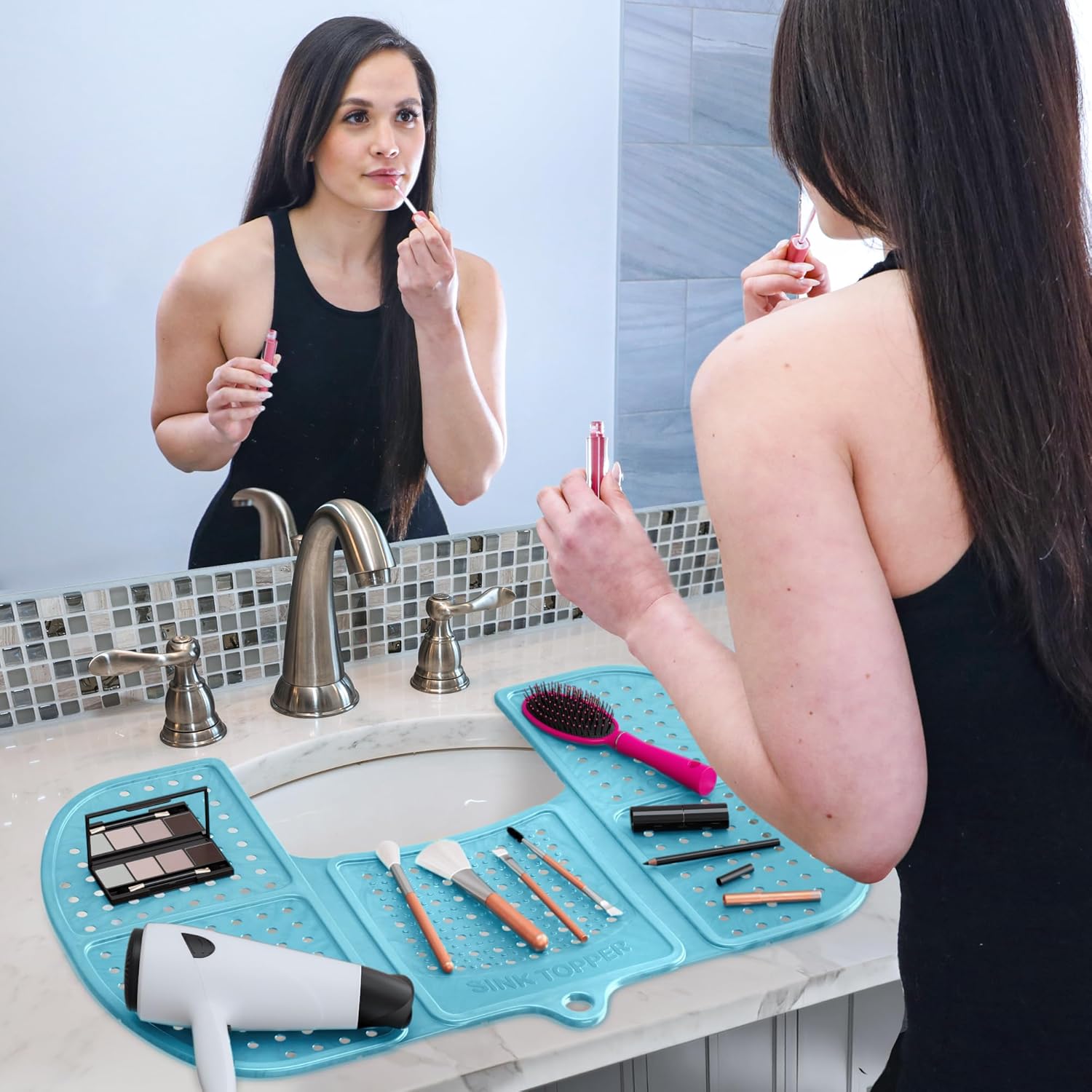 - MULTIPURPOSE SINK SOLUTION – Upgrade your sink area with this foldable silicone topper that adds extra space, protects against heat up to 480°F, and keeps essentials organized. Slip-resistant and strong enough to hold up to 7 lbs, it’s perfect for makeup brushes, hot tools, or cleaning items. Wondering if it fits your sink? Available in Small and Large sizes—just measure before ordering for the best fit at home or while traveling.